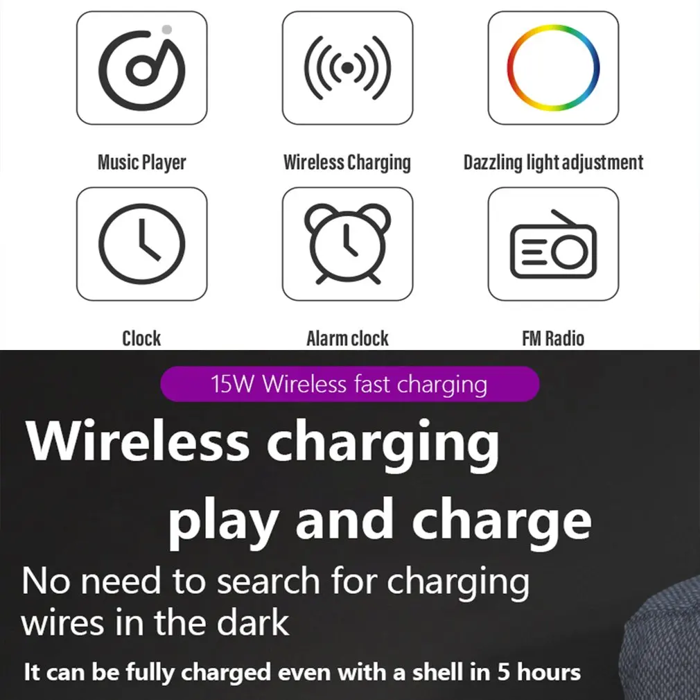 - Function Description: This device offers 15W Fast Wireless Charging, an atmosphere lamp, a bedside lamp, dazzling light effects, Bluetooth audio, and speaker play. It also supports Aux, TF, Time, and Alarm Clock modes.