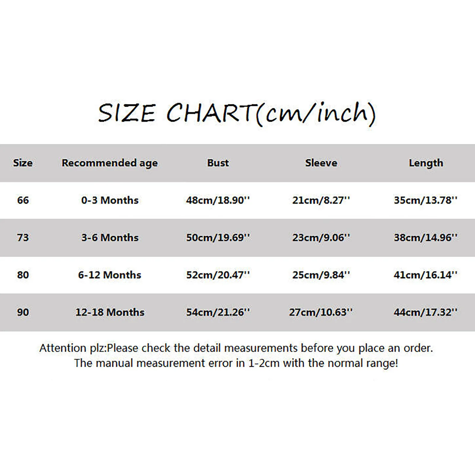 - Size: 73 | Recommended age: 3-6 Months | Bust: 50cm/19.69” | Sleeve: 23cm/9.06” | Length: 38cm/14.96”