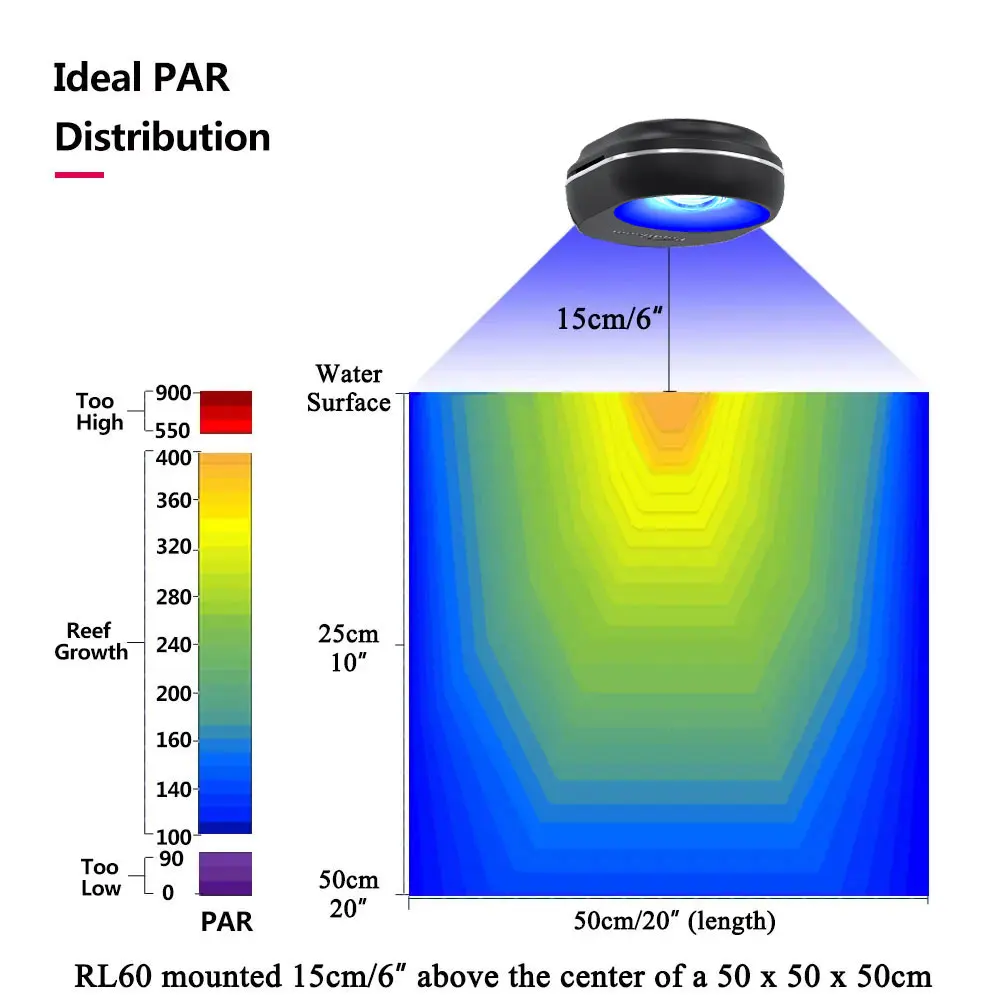 - Perfect for Nano and Mid-Size Reef Tanks – With a 60W output, it’s ideal for compact marine aquariums, offering deep light penetration and uniform coverage.
