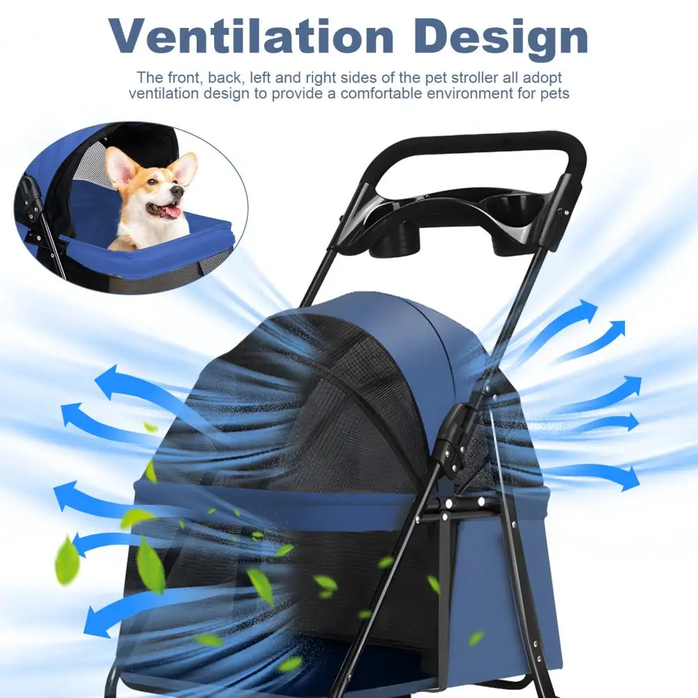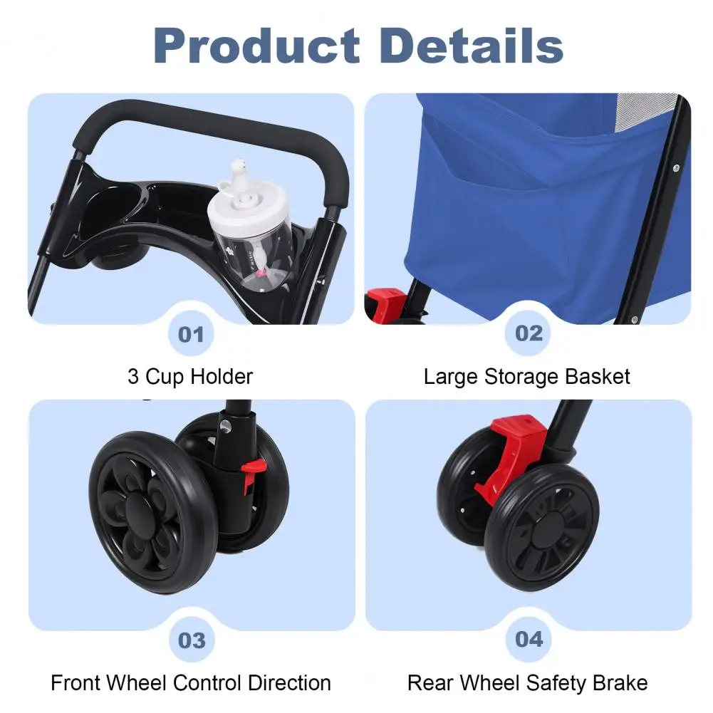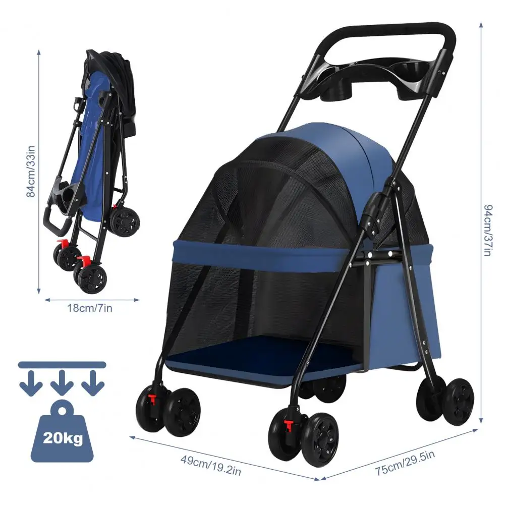 Navy Foldable 4 Wheel Pet Stroller Cup Holder