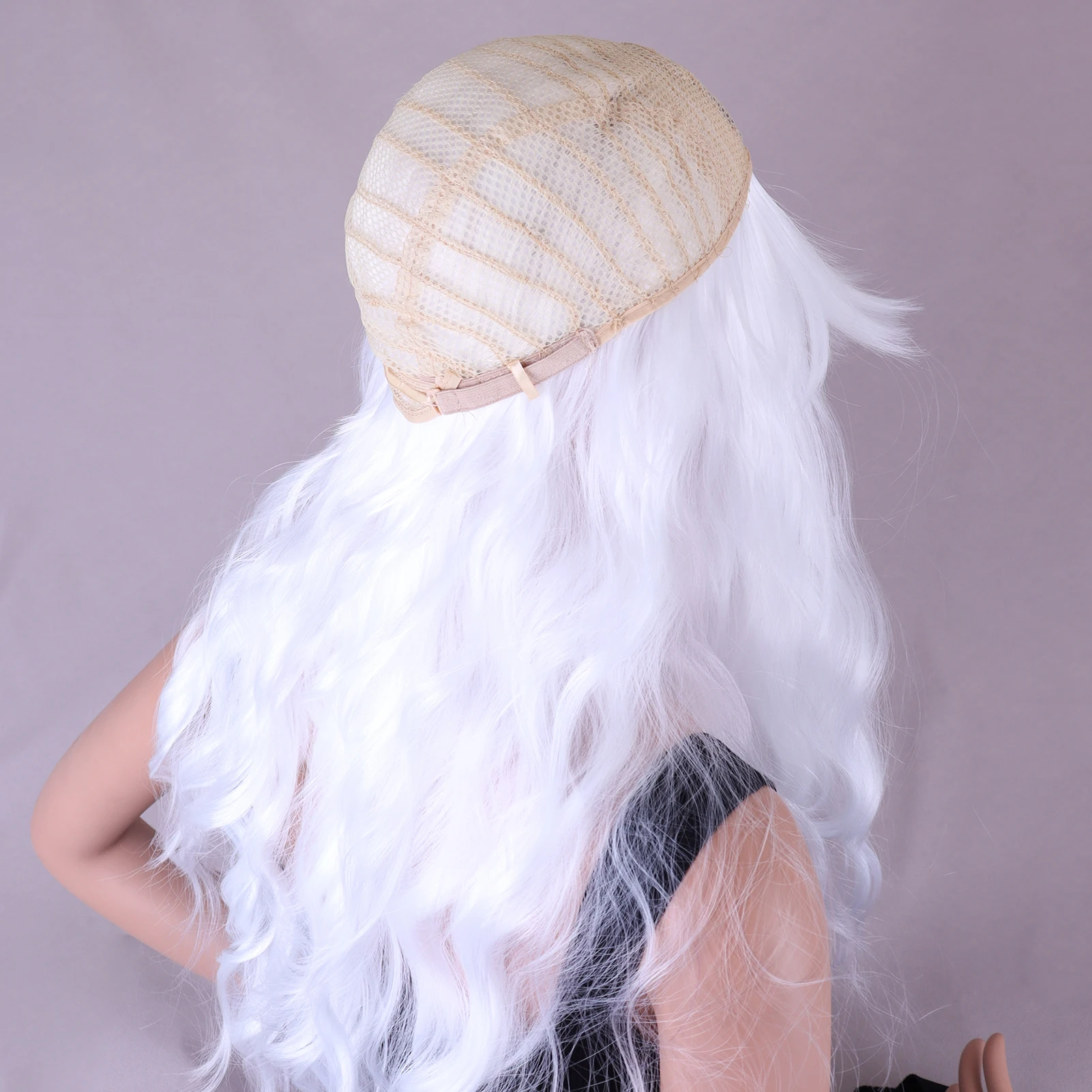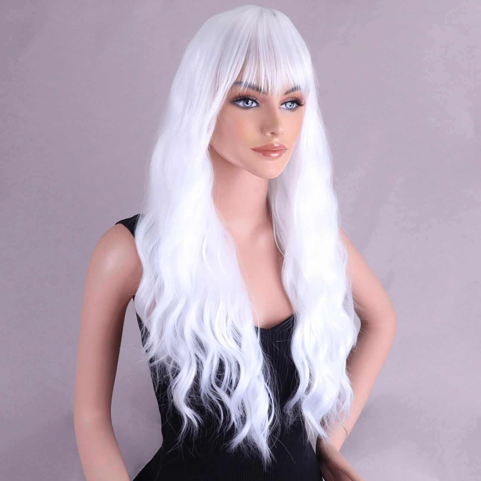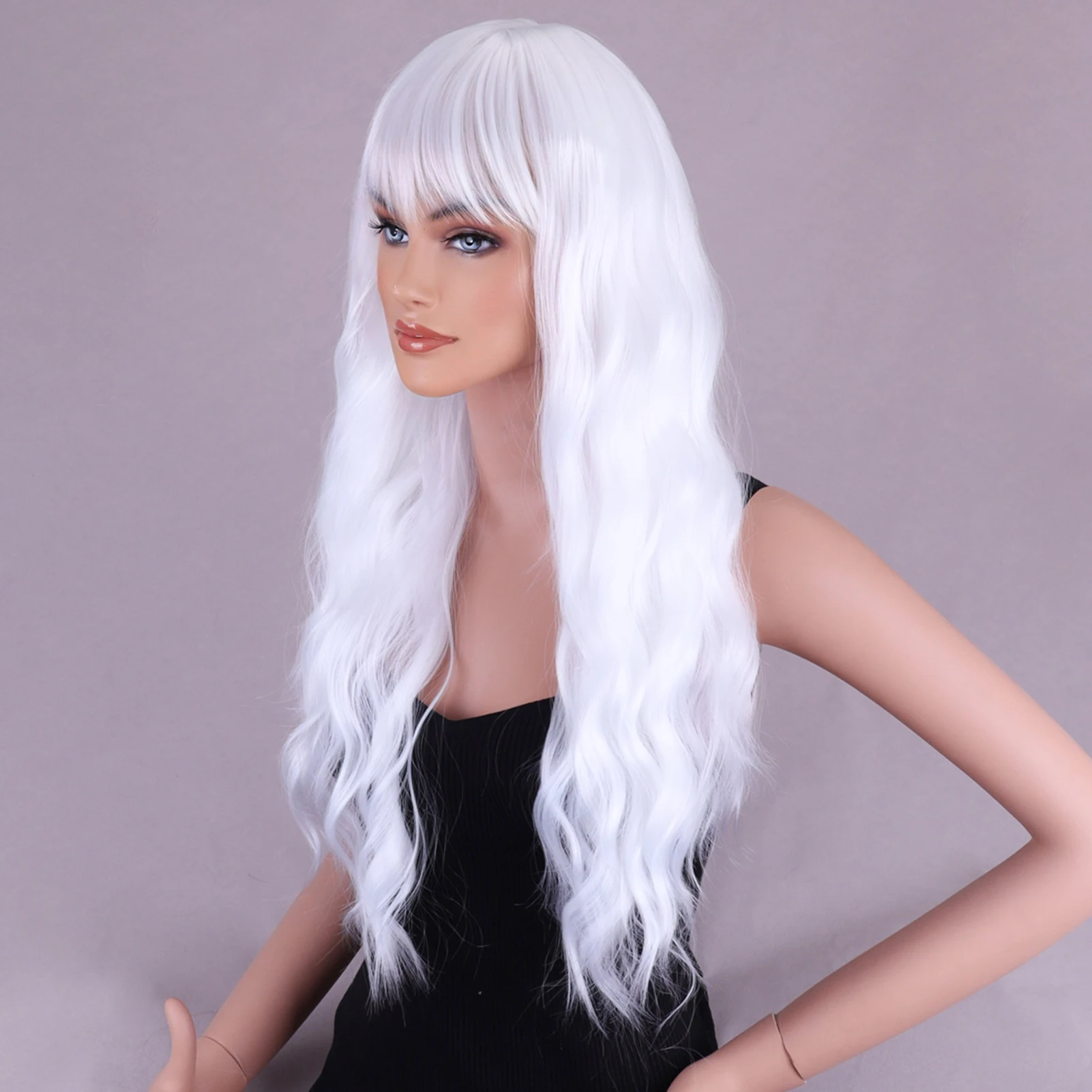 White long wig with bangs made from heat-resistant synthetic fiber for a natural look and breathable comfort. Ideal for daily wear, parties, cosplay, photography, and stage performances.