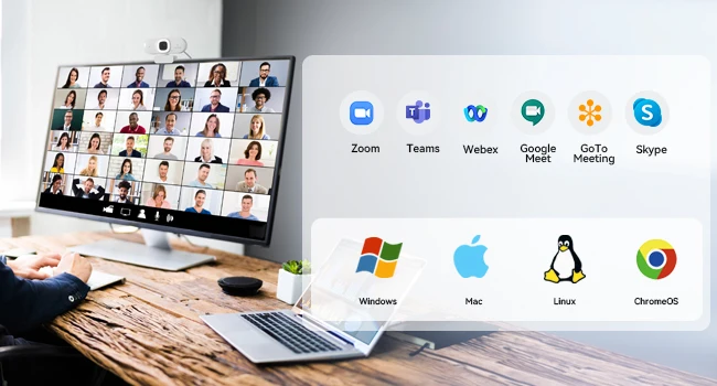 Works with most systems and apps. This USB webcam is compatible with desktop and laptop computers running Windows, macOS, and Linux. It works smoothly with popular platforms like Facebook, YouTube, FaceTime, OBS, Swift Capture, XSplit, Twitch, and conferencing tools like Zoom, Teams, Google Meet, and more.
