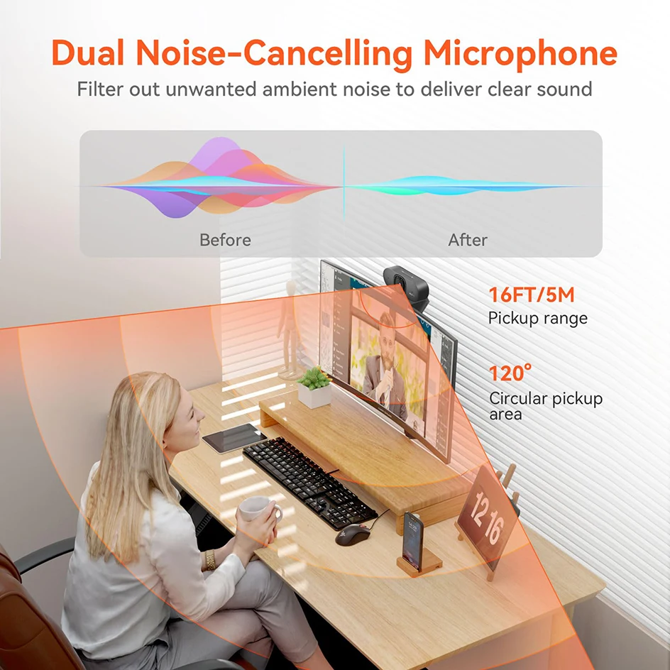 This webcam includes two built-in high-quality microphones with noise cancellation to help your voice sound clearer and more natural. The mics can pick up detailed audio from a wider area in front of the camera, not just right next to the lens.