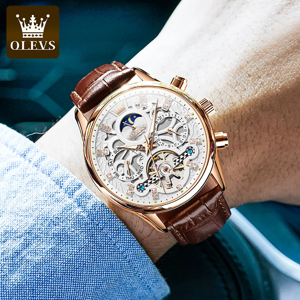 OLEVS Auto Skeleton Watch Waterproof & Leather Strap