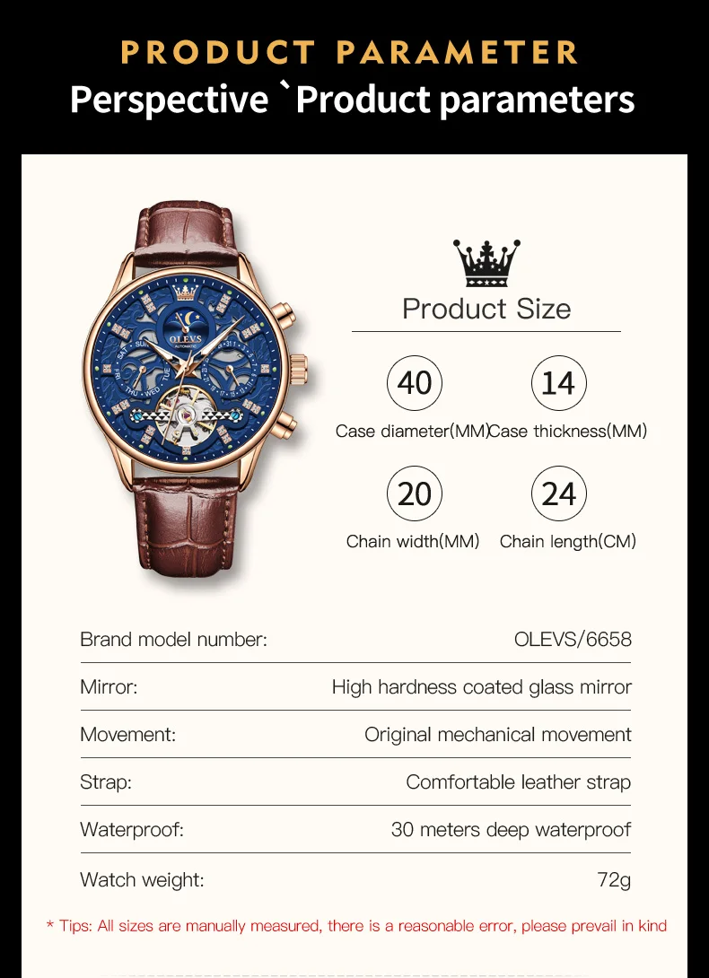 Attention to detail is evident in every aspect of the watch, from the choice of materials to the functionality. The leather used for the strap and the case material is of the highest quality, ensuring that the watch not only looks good but also stands the test of time. The model number 6658 signifies this particular design’s uniqueness in the OLEVS collection, a brand renowned for its commitment to excellence and innovation in watchmaking.