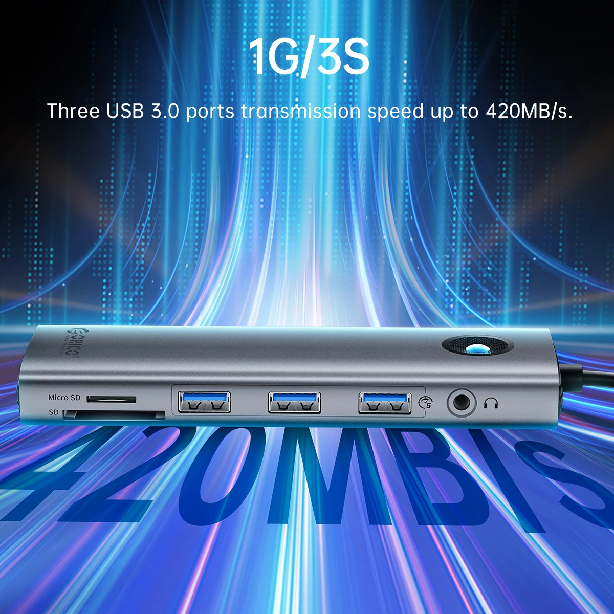 - Grey 9-in-1 30Hz VGA: USB-A x3 (5Gbps), SD & TF x1, HDMI x1 (4K@30Hz), VGA x1 (1080P), RJ45 (GigE) x1, PD100W x1