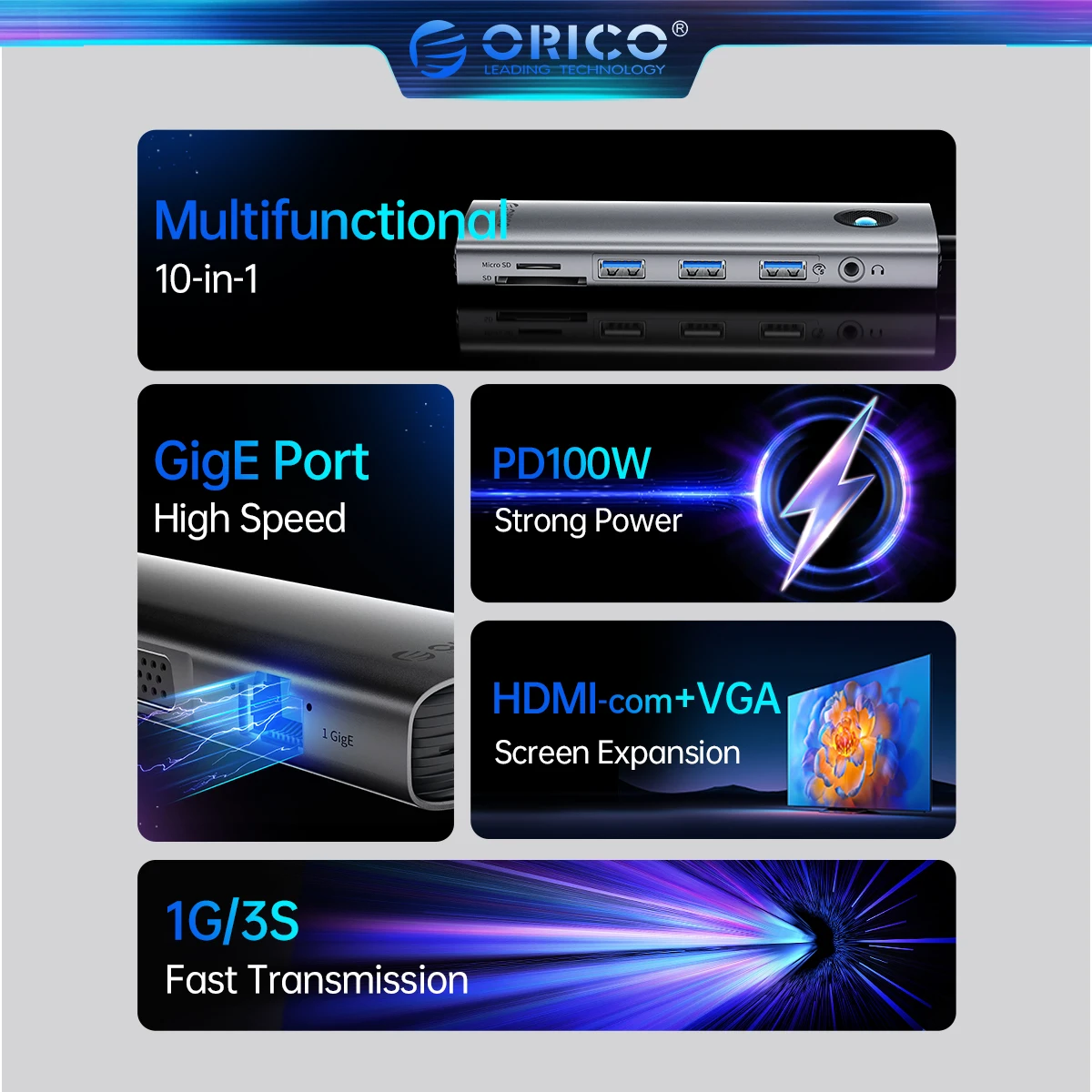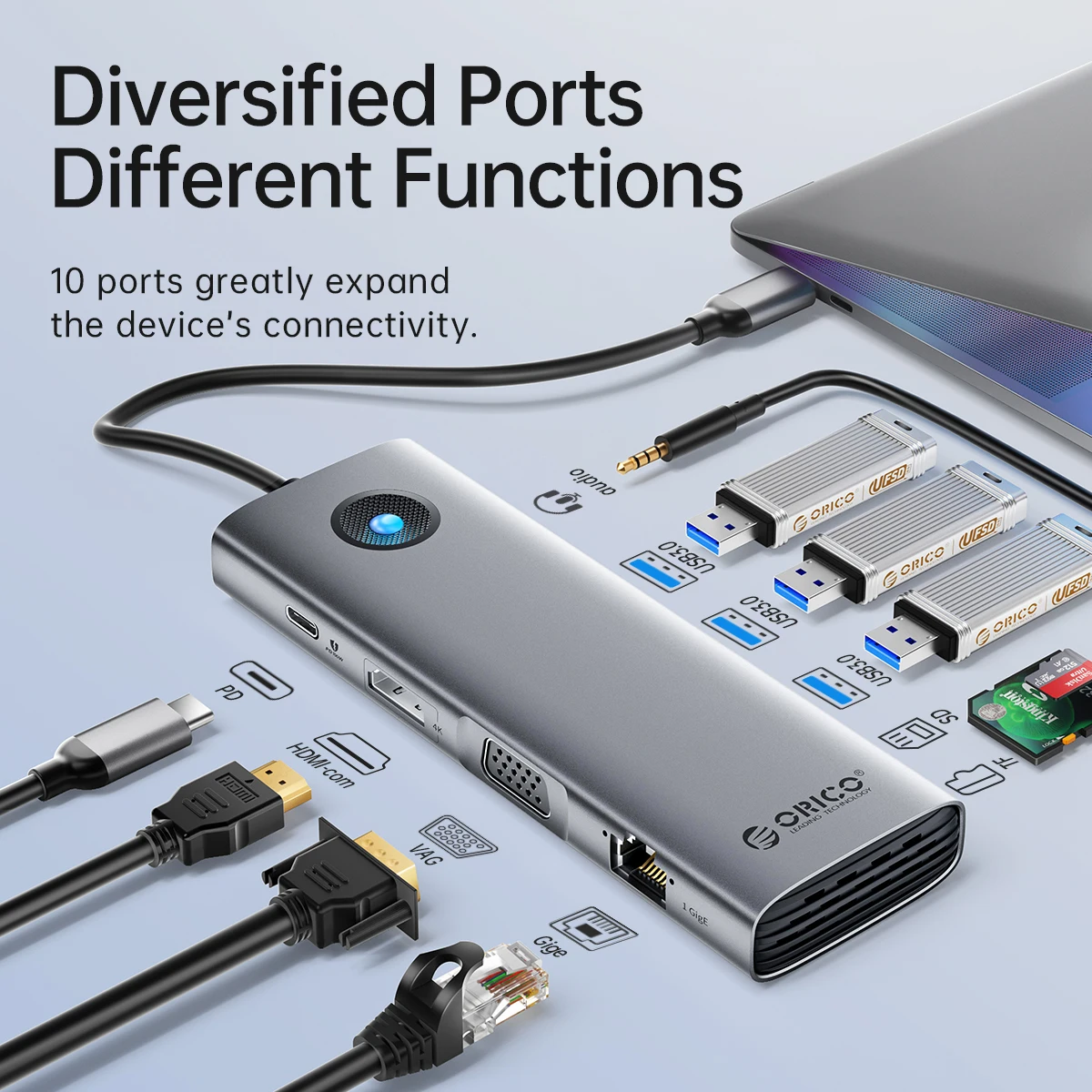 - Grey 10-in-1 30Hz AUD: USB-A x3 (5Gbps), 3.5mm x1, SD & TF x1, HDMI x1 (4K@30Hz), VGA x1, RJ45 (GigE) x1, PD100W x1