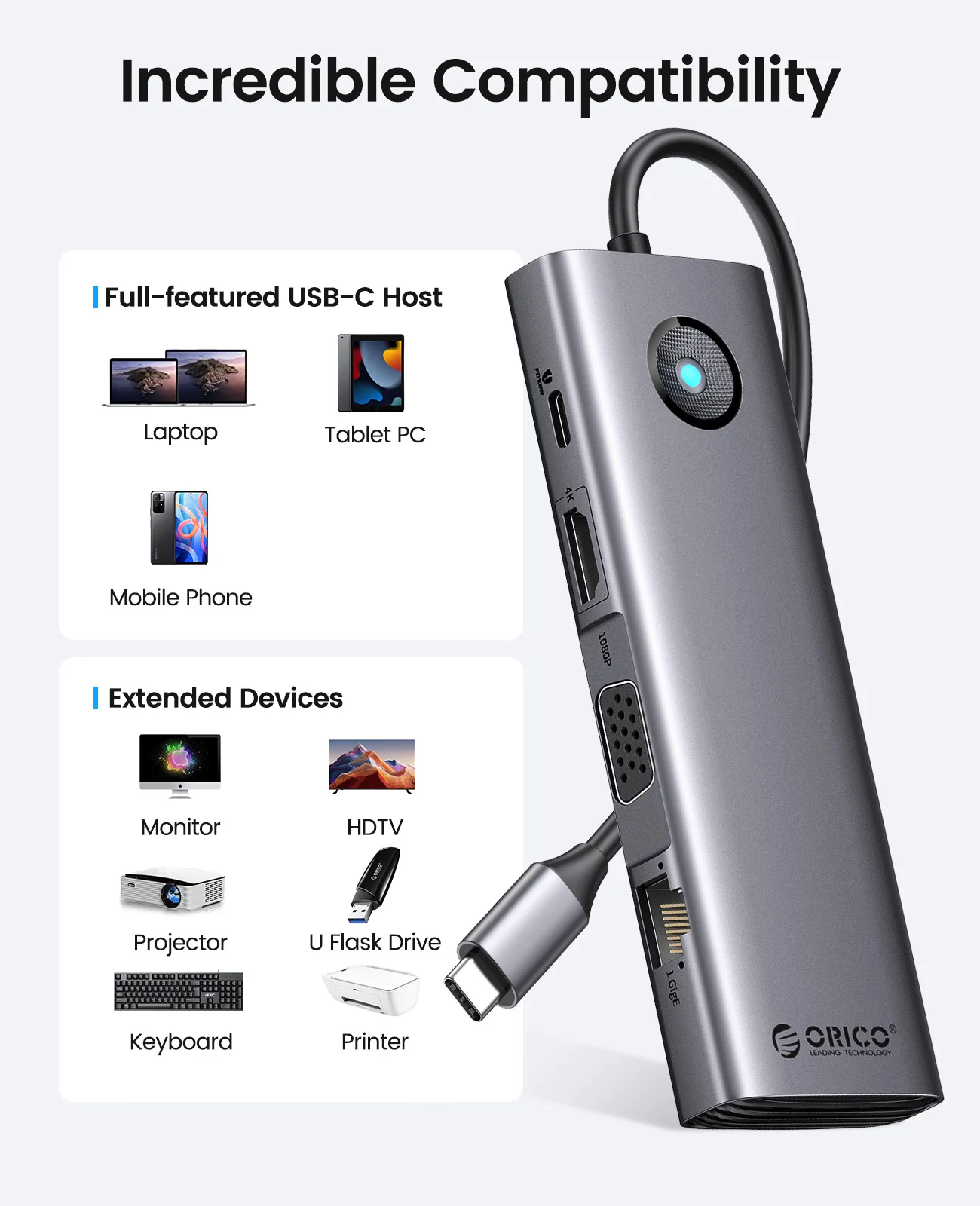- Grey 8-in-1 60Hz VGA: USB-A x2 (5Gbps), USB-A x1 (480Mbps), USB-C x1 (5Gbps), PD100W x1, HDMI x1 (4K@60Hz), VGA x1 (1080P@60Hz), RJ45 (GigE) x1