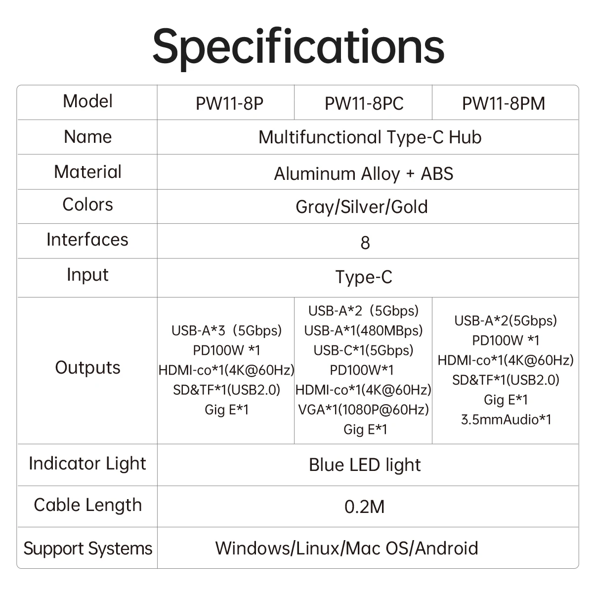 - Grey 8-in-1 60Hz AUD: USB-A x2 (5Gbps), PD100W x1, HDMI x1 (4K@60Hz), SD & TF x1 (USB2.0), RJ45 (GigE) x1, 3.5mm x1