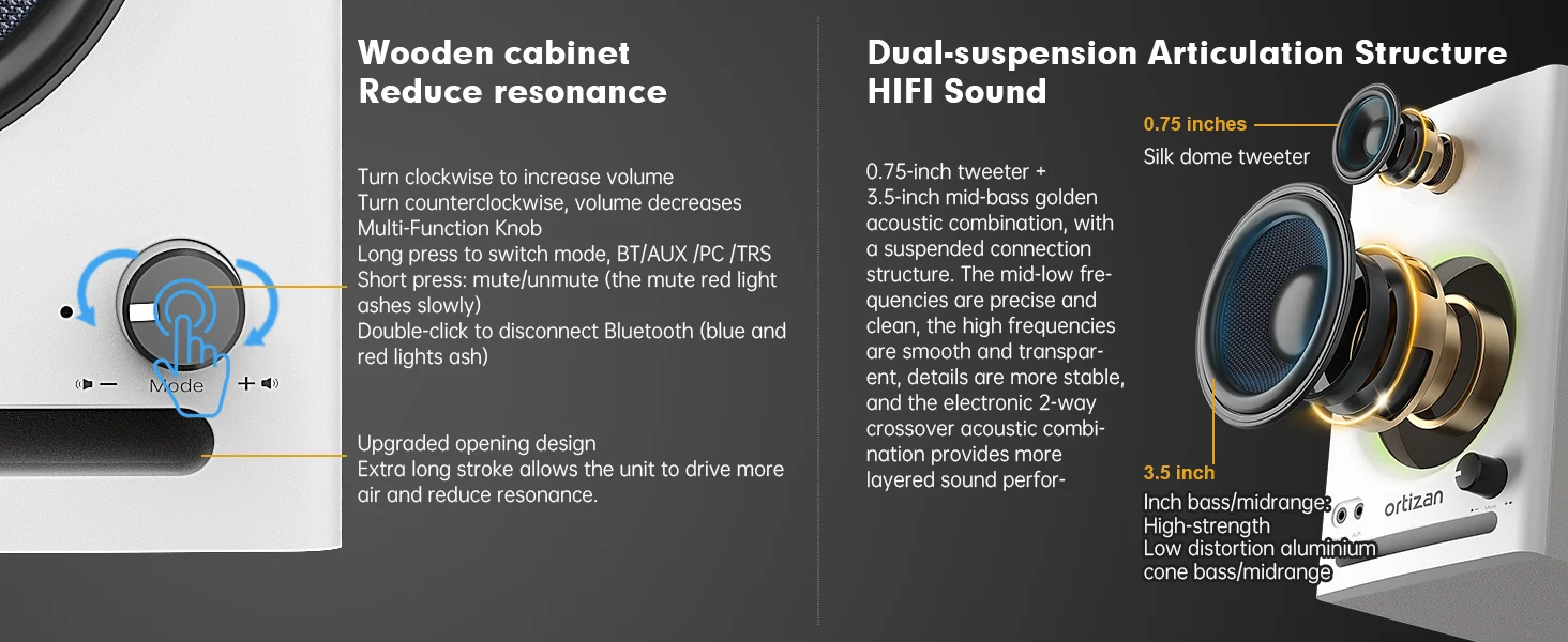 The 0.75-inch tweeter and 3.5-inch mid-bass golden acoustic combination, with a suspended sound structure, delivers precise and clean mid-low frequencies, smooth and transparent highs, and more stable details. Paired with an electronic 2-way crossover acoustic combination, it provides a more layered sound performance, offering you an exceptional auditory experience.