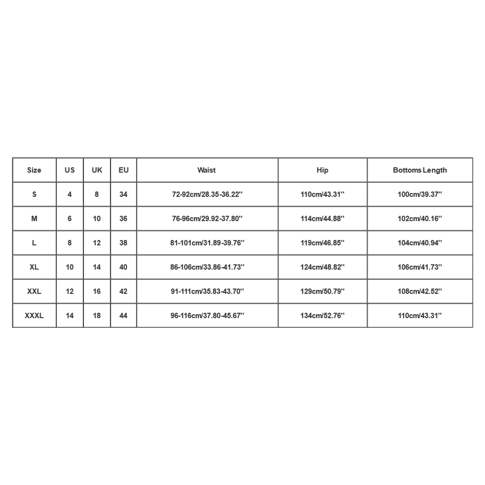 Size: XXXL, US: 14, UK: 18, EU: 44, Waist: 96-116cm/37.80-45.67”, Hip: 134cm/52.76”, Bottoms Length: 110cm/43.31”