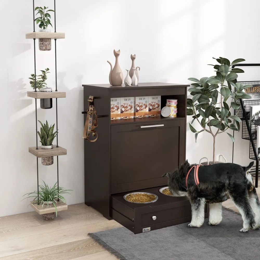 - Store Pet Supplies: Store all your pet supplies in a single spot with this pet feeder station. The three hooks on the side can hold harnesses and leashes. The pull-out cabinet can store food bags. The shelf and countertop can hold cans, pet jackets, or treats.