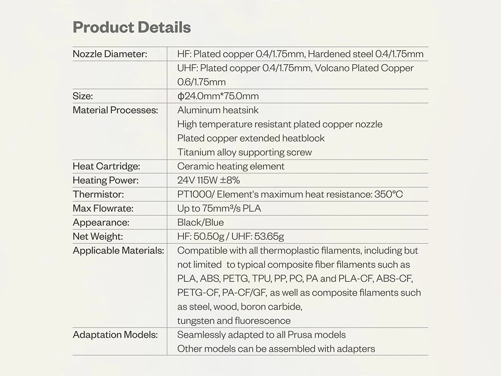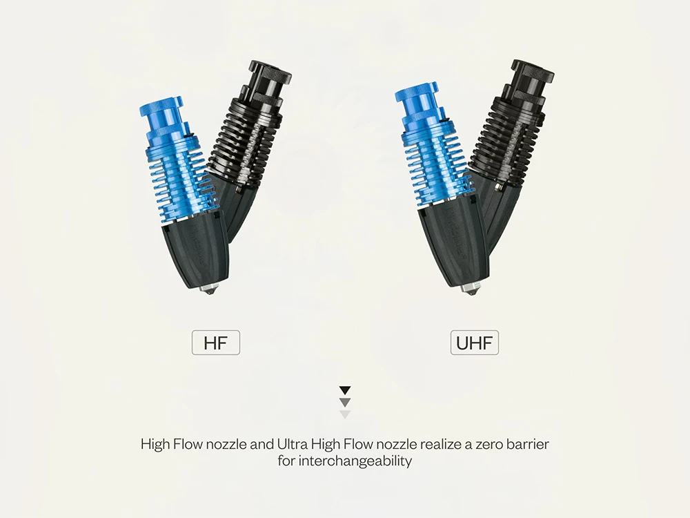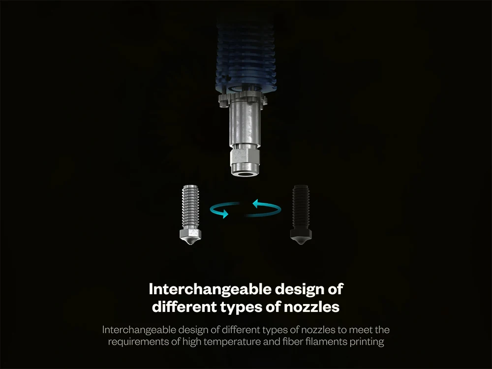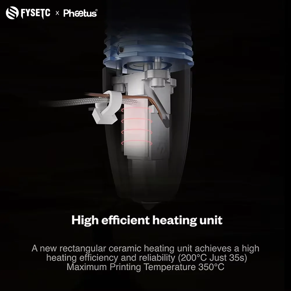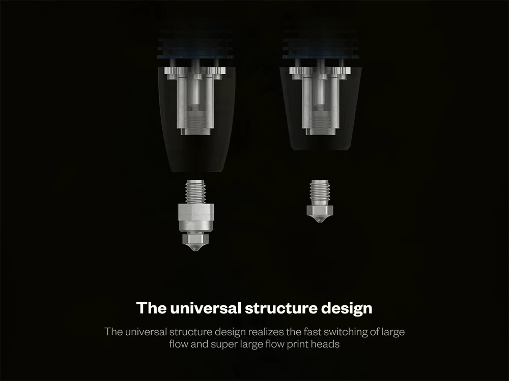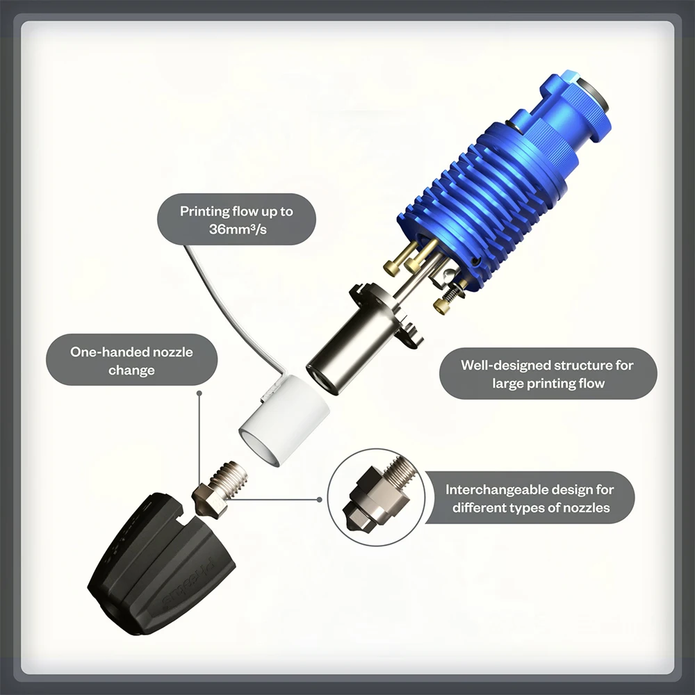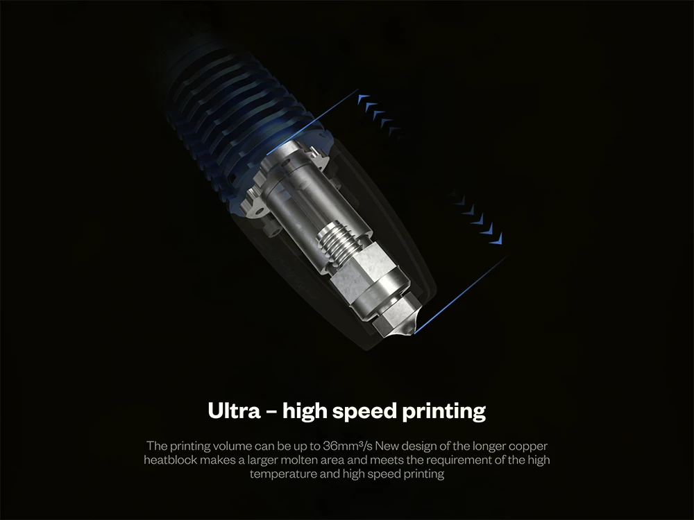 Plated copper extended heatblock, filaments melt faster, resulting in faster printing speed;