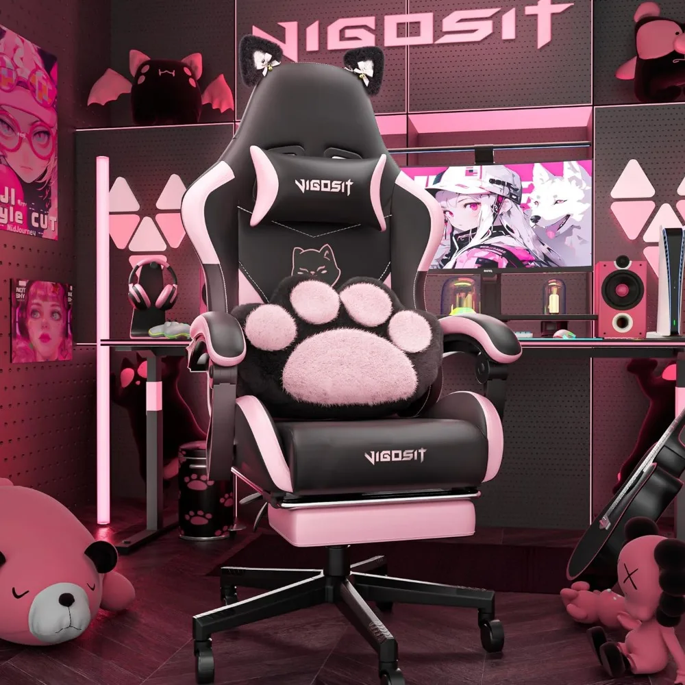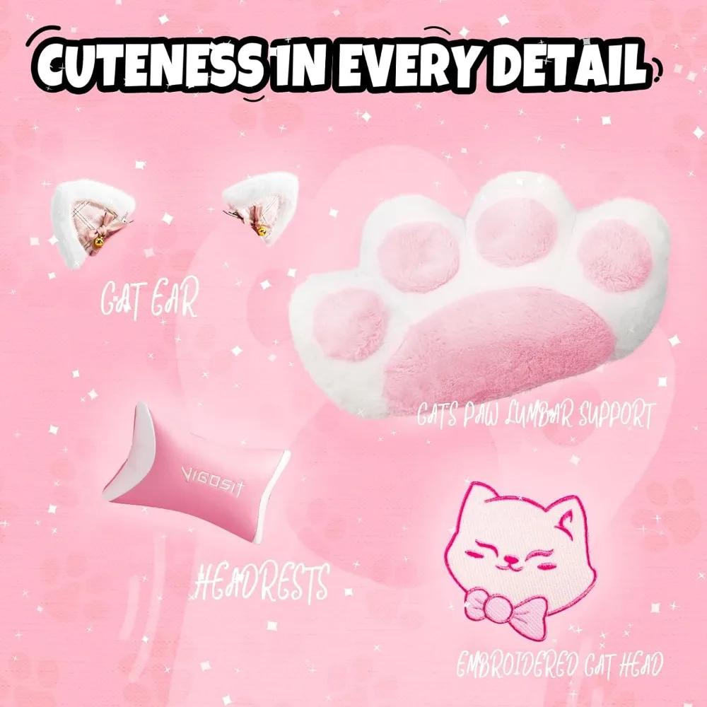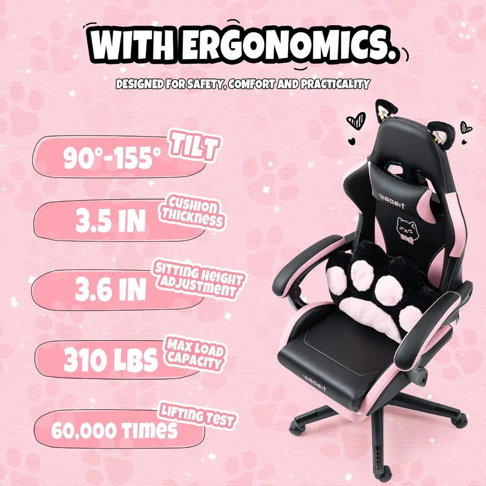 Pink Gaming Chair with Cat Ears and Paw Lumbar Cushion