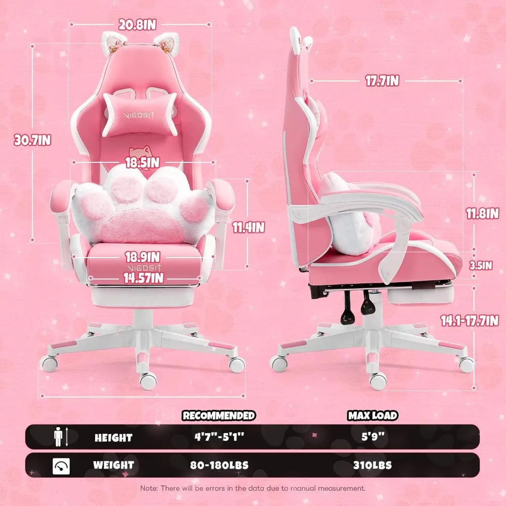 - A more suitable gaming chair for women: We specifically chose the wider and thicker Cat’s Paw lumbar pillow for this gaming chair. The surface of the lumbar pillow is soft velvet and filled with a full sponge, which is more suitable for girls and brings support to the waist. The headrest can also be adjusted up and down.