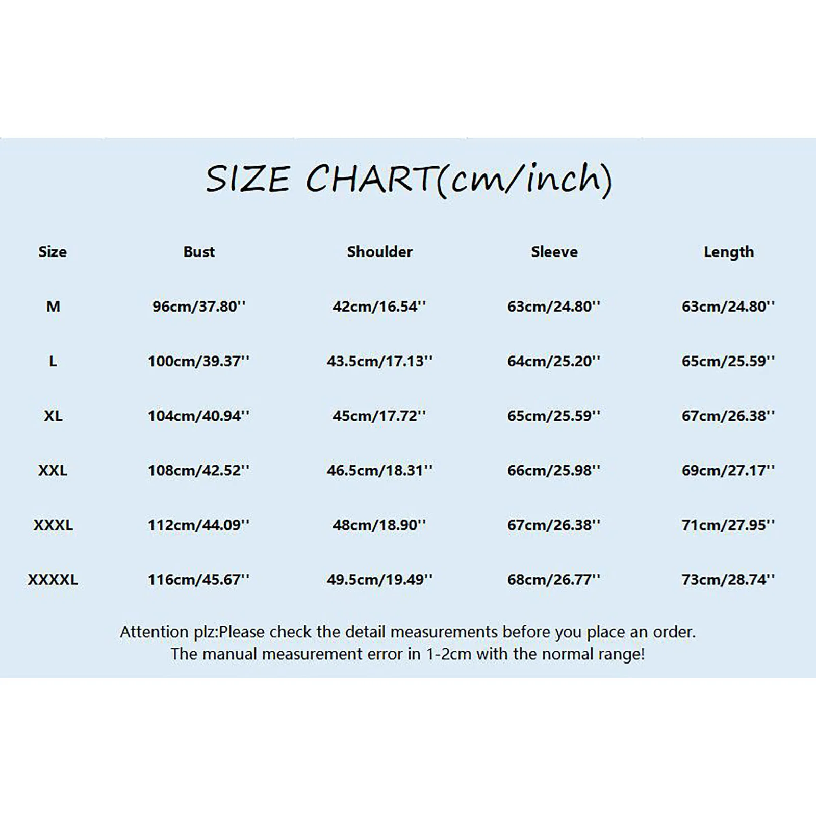 - XXXXL: Bust: 116cm/45.67” • Shoulder: 49.5cm/19.49” • Sleeve: 68cm/26.77” • Length: 73cm/28.74”