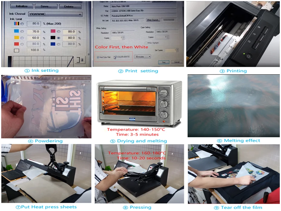 - Pressing: Place the printed film on the T-shirt, cover it with a hot press sheet, and press at 160-180°C for 10-20 seconds. Recommended sheets: