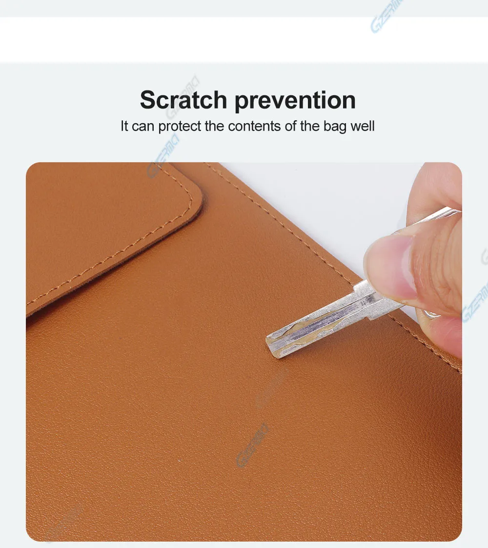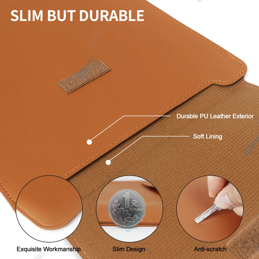 High-Quality Materials: This sleeve is constructed from water-resistant PU leather with a soft lining. It offers effective protection against scratches, water spills, coffee, and dust.