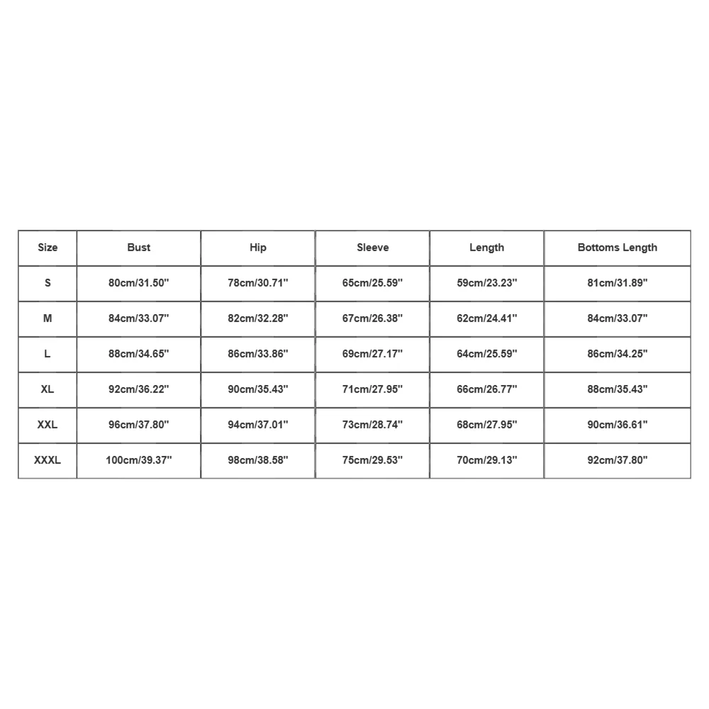 - XXXL: Bust 100cm/39.37”, Hip 98cm/38.58”, Sleeve 75cm/29.53”, Length 70cm/29.13”, Bottoms Length 92cm/37.80”