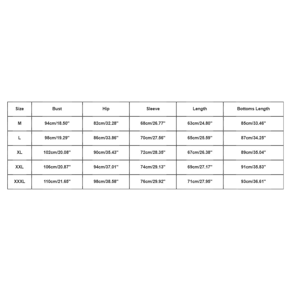 - XXXL: Bust: 110cm/21.65”, Hip: 98cm/38.58”, Sleeve: 76cm/29.92”, Length: 71cm/27.95”, Bottoms Length: 93cm/36.61”