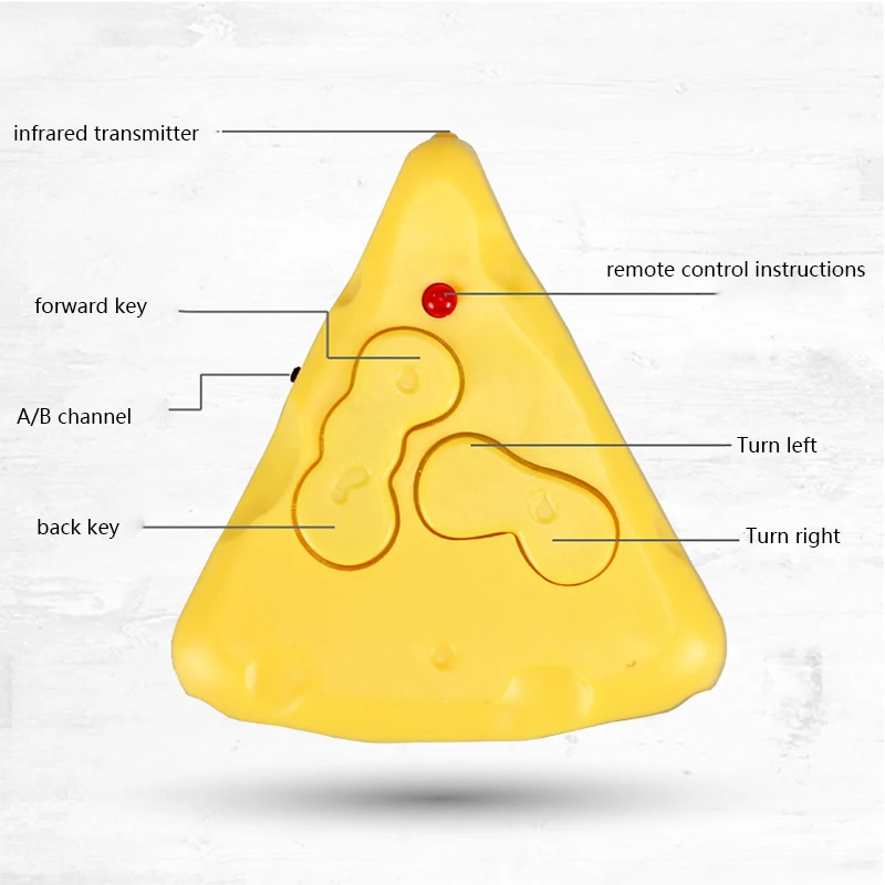 - This product is a four-way infrared remote control plush mouse, which comes with a cheese-shaped remote control. It features forward drift and backward drift capabilities, as well as the ability to rotate left and right.