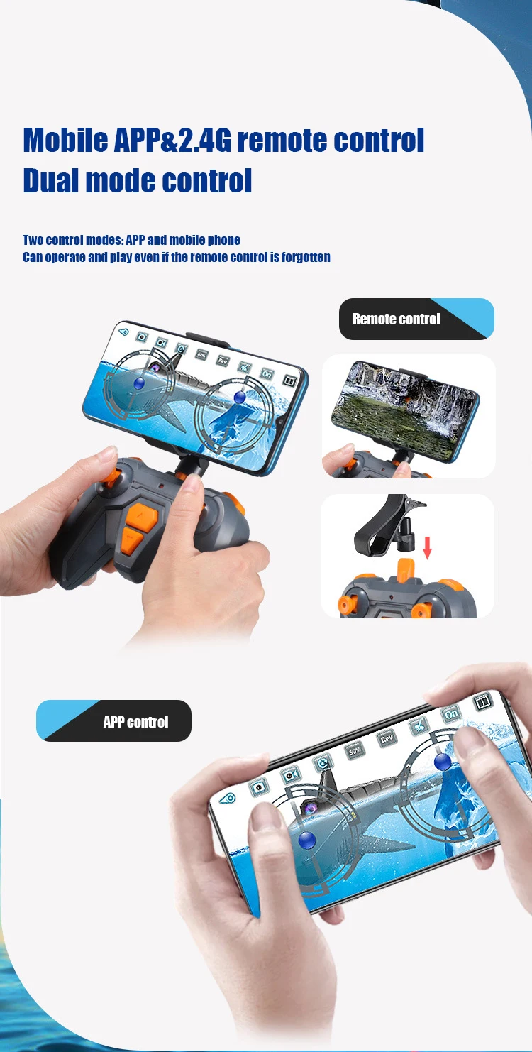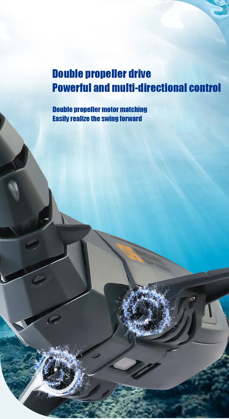 - 2.4 GHz Remote Control: This toy features a high-frequency 2.4 GHz remote control system, complete with an underwater searchlight. It’s ideal for multi-player competitions as it prevents interference between devices. The toy can move forward and backward, and its double-mounted propellers provide robust power for acceleration and deceleration, offering free movement in water.