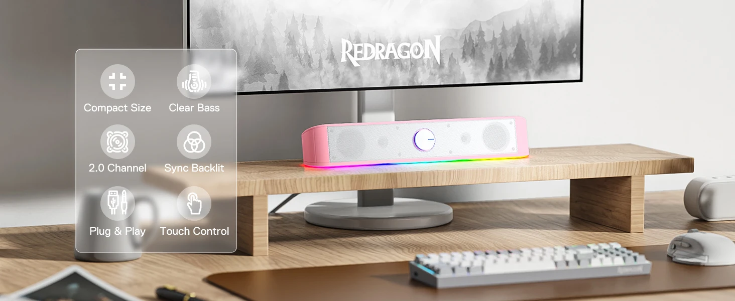 Upgrade your audio and visual experience simultaneously. The Redragon Compact Gaming Soundbar is the perfect addition to any modern desktop setup, offering powerful sound, vibrant RGB aesthetics, and convenient features that enhance every moment. Get yours today and illuminate your workspace like never before!