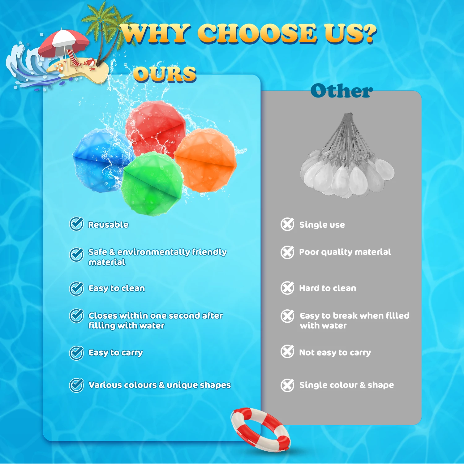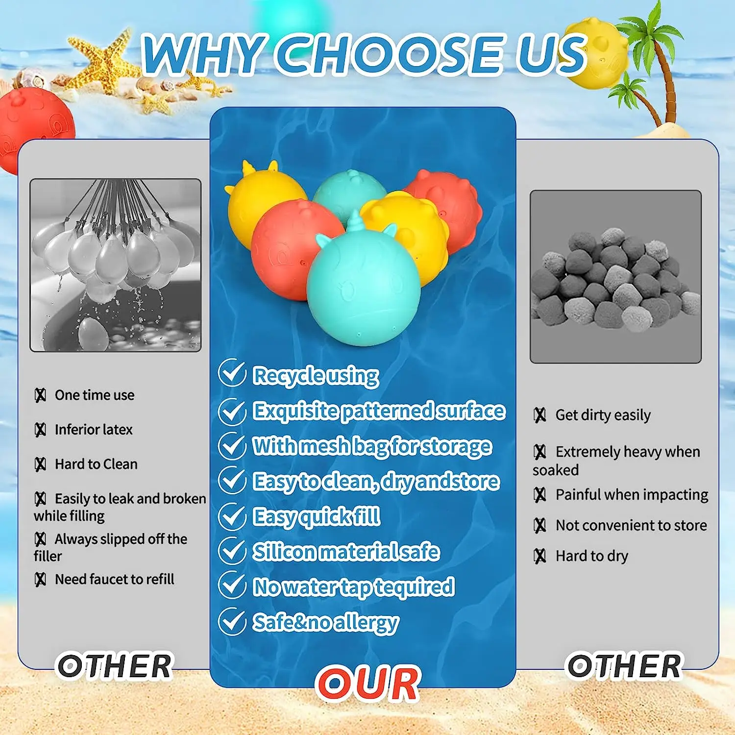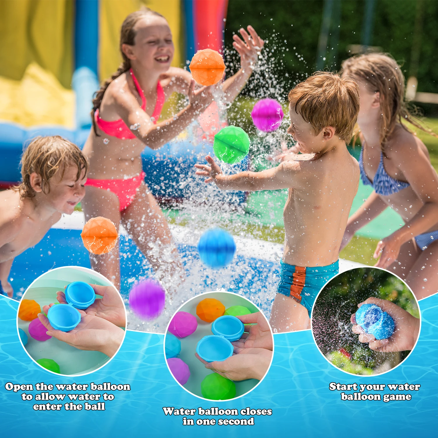Reusable Water Balloons – Enjoy endless summer fun with our innovative, eco-friendly reusable water balloons. Made with soft, latex-free silicone, these balloons seal and suction, eliminating the need for cleanup. Each balloon can be reused over 2,000 times, saving you money and reducing waste. Perfect for fun outdoor activities, also known as aquaballs, water bombs, or splash balls.
