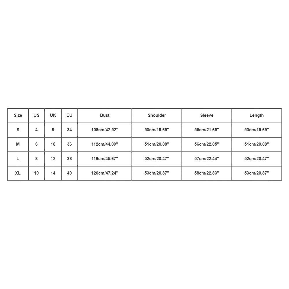 - Size XL: US 10, UK 14, EU 40. Bust: 120cm/47.24”, Shoulder: 53cm/20.87”, Sleeve: 58cm/22.83”, Length: 53cm/20.87”.
