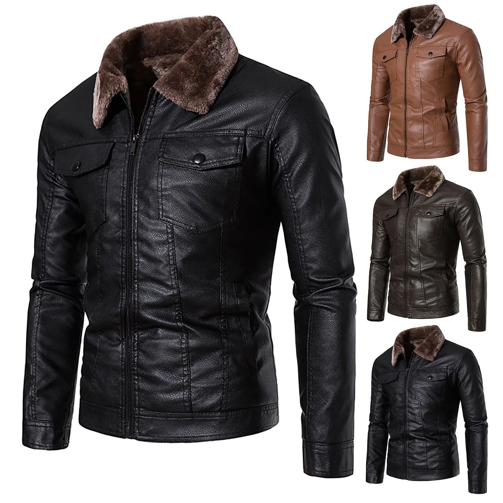 Men’s Collar Autumn and Winter New Thickened and Velvet Fashion Leather Jacket