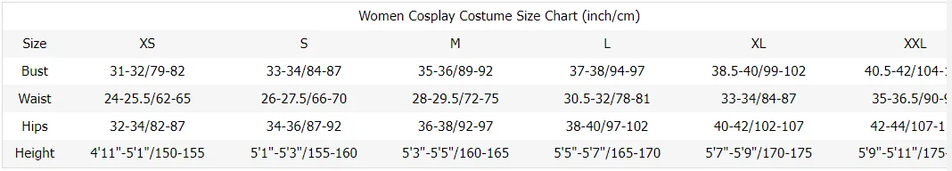 - Height: XS: 4’11”-5’1″/150-155, S: 5’1″-5’3″/155-160, M: 5’3″-5’5″/160-165, L: 5’5″-5’7″/165-170, XL: 5’7″-5’9″/170-175, XXL: 5’9″-5’11″/175-180