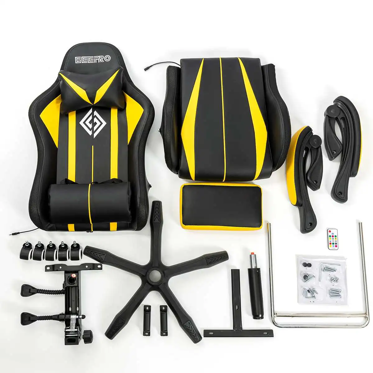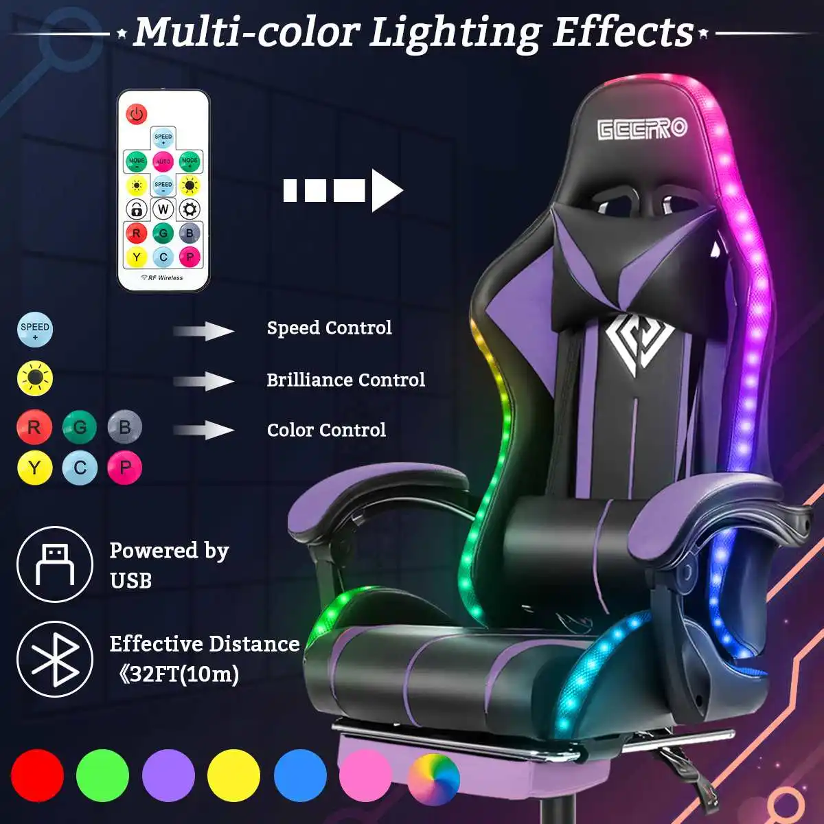 Colorful RGB LED Lights: The chair features LED lights on the back and seat edges, with multiple lighting modes and brightness levels adjustable via remote control, adding a dynamic touch to your gaming space.