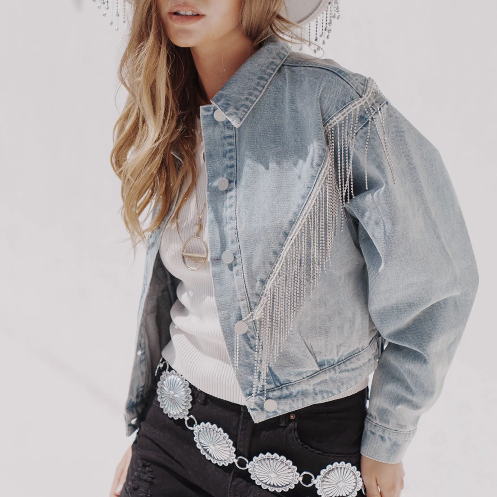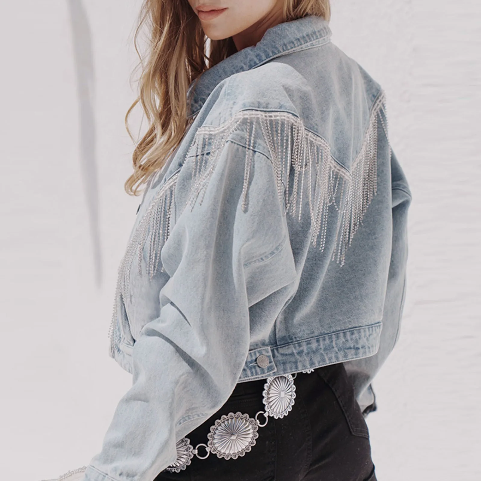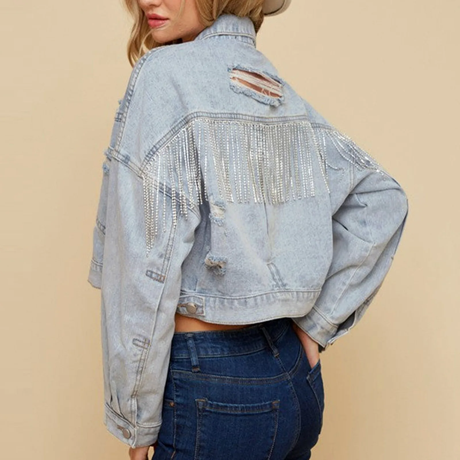 - Pattern Type: The garment is adorned with a solid pattern, complemented by a rhinestone tassel decoration, enhancing its visual appeal.
