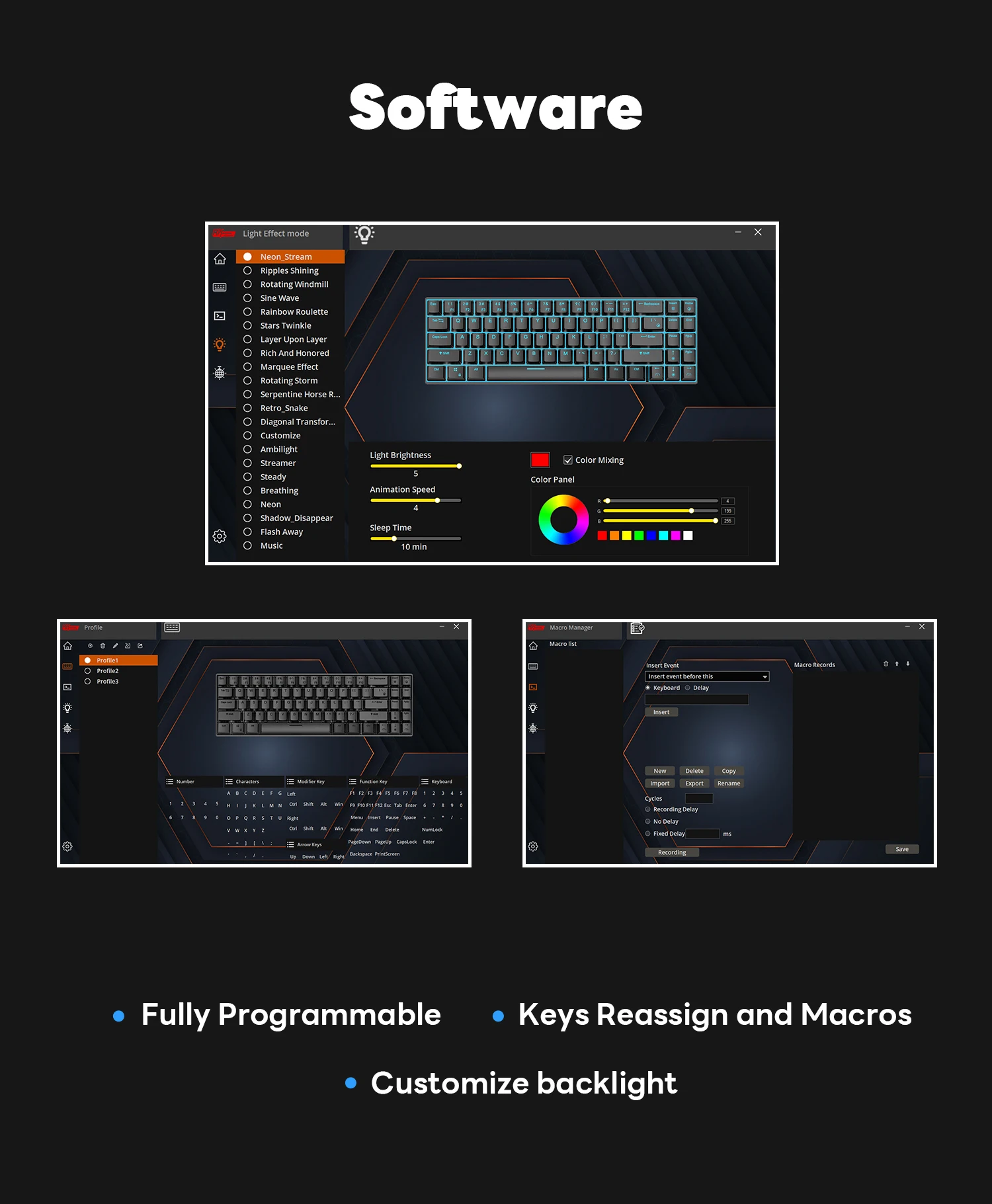 - DIY programmable – Software for custom lighting, powerful game macros, and full-key programming.