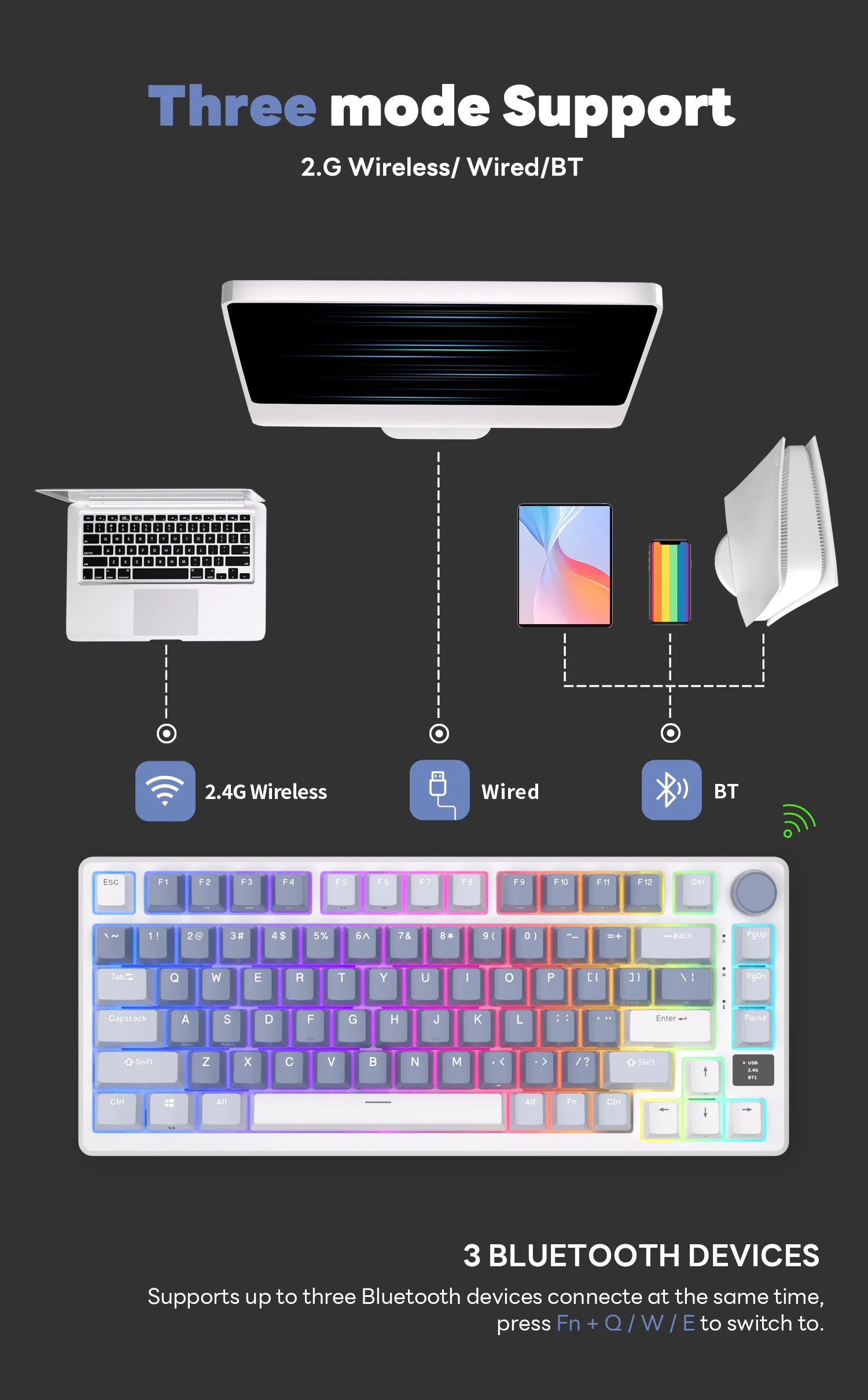 - Three modes – USB-C wired, 2.4G wireless, and Bluetooth 5.1. Connect up to 3 devices via Bluetooth and switch with the knob; compatible with Windows and Mac.