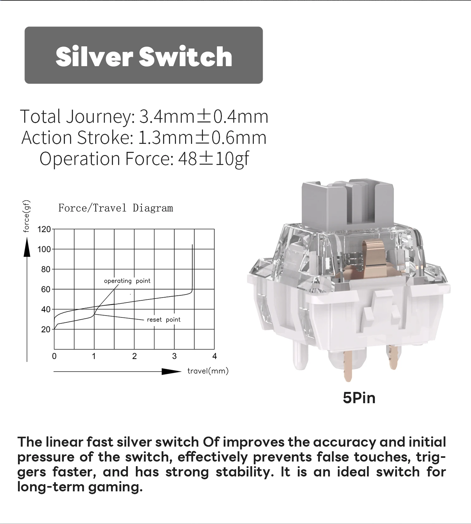 - Hot-swappable – 3/5-pin hot-swap PCB. The linear Fast Silver switch improves accuracy, prevents mis-touches, triggers faster, and remains stable for long sessions.