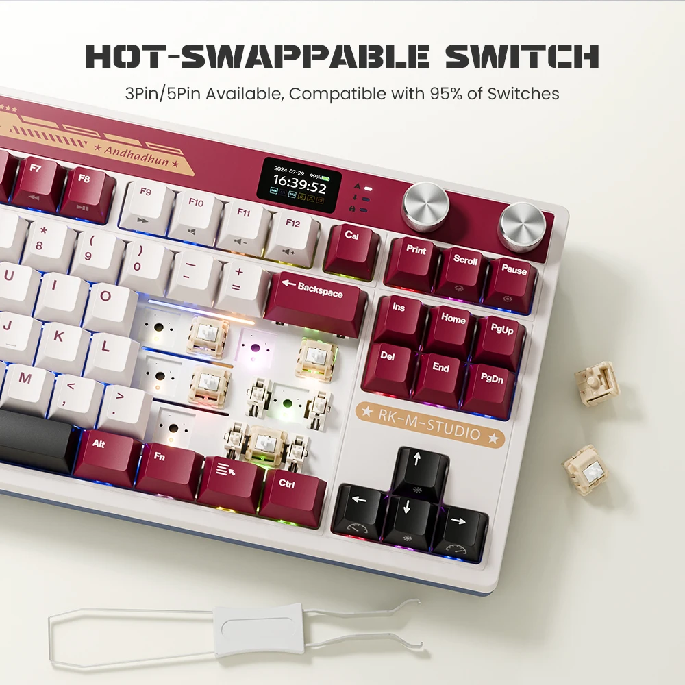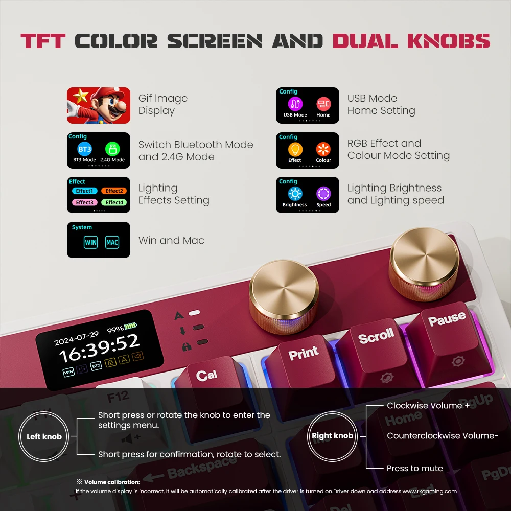 - Dual Knobs: Left knob controls keyboard settings; right knob controls volume. All functions are integrated and shown on the screen for easy setup.