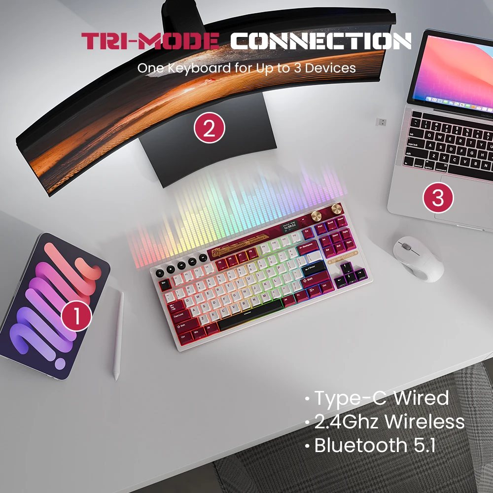- Three Modes: USB-C wired, 2.4G wireless, and Bluetooth 5.1. Connect up to three devices via Bluetooth and switch with the knob. Compatible with Windows and Mac.