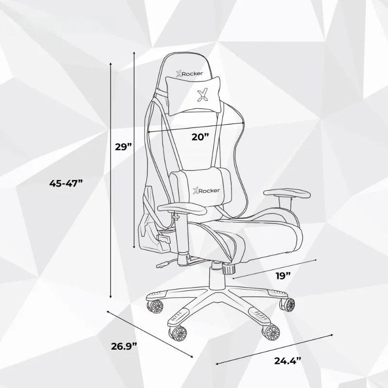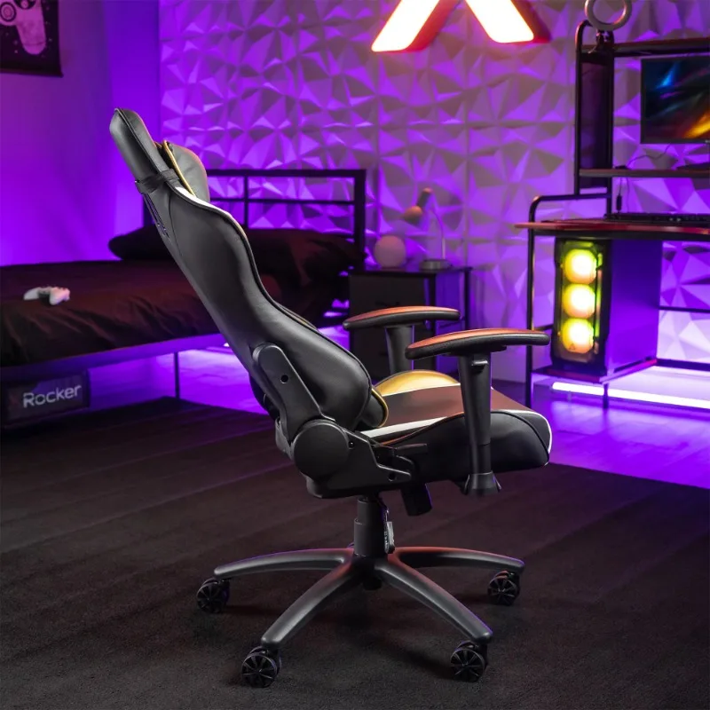 The Gaming Chair is designed to set young gamers up for success, offering a chair tailored to their needs. It mirrors the benefits of a full-sized PC/office gaming chair, boasting a luxurious seating surface. The chair features 2D adjustable armrests, which can be moved up and down or angled inward and outward for optimal comfort. Its durable, faux-leather surface is easy to clean and connects to a 5-star swivel rolling base, ensuring smooth movement. The chair also offers a reclining and tilting function for the perfect resting position. With dimensions of 26.9 x 24.4 x 45-47 inches, this elegant black, gold, and white chair is ideal for younger gamers eager to enhance their gaming experience and progress towards professional gaming.