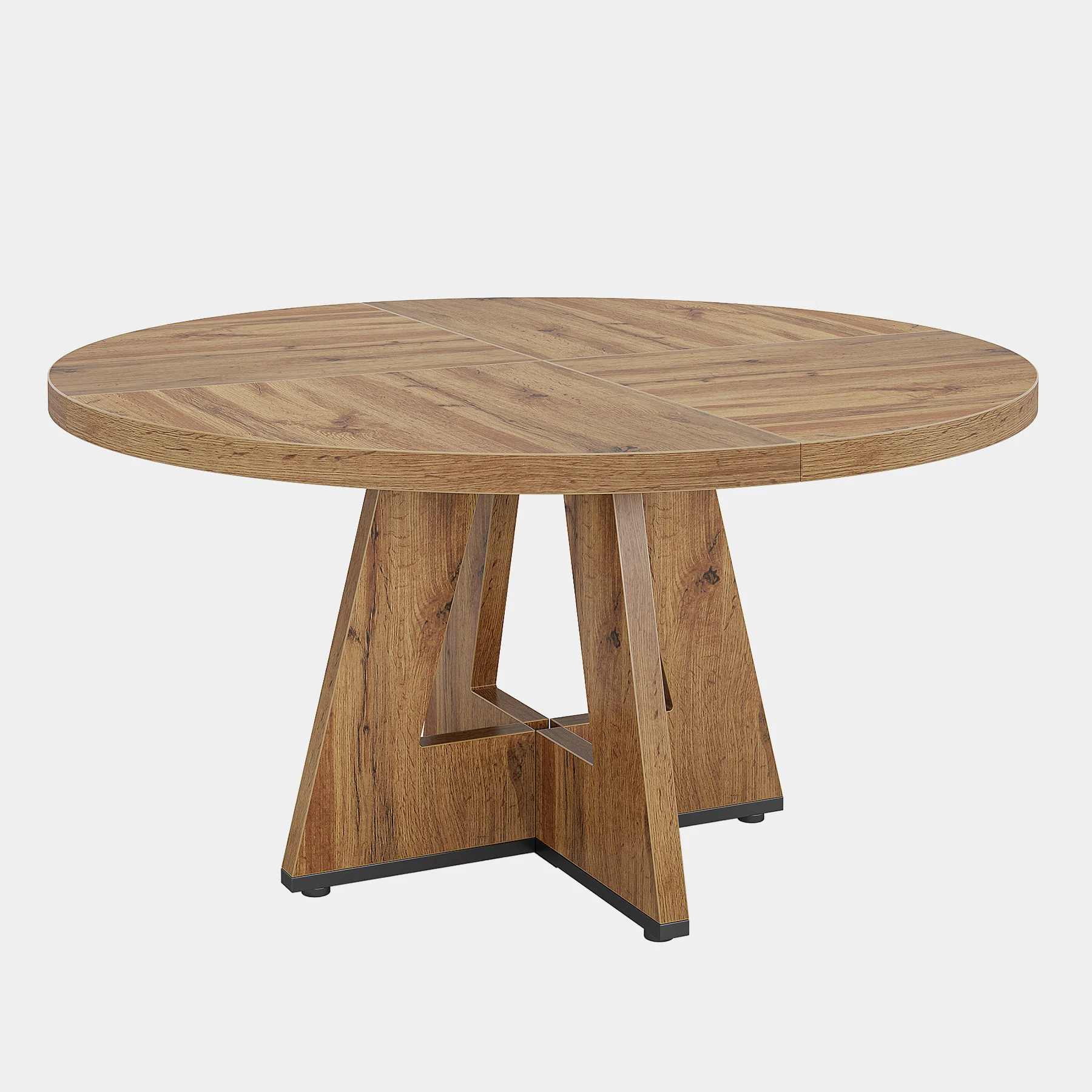 Farmhouse round dining table – The spacious tabletop consists of four engineered-wood boards. With its classic farmhouse design and warm retro brown finish, this round table adds rustic elegance and creates a cozy, welcoming space for gatherings.