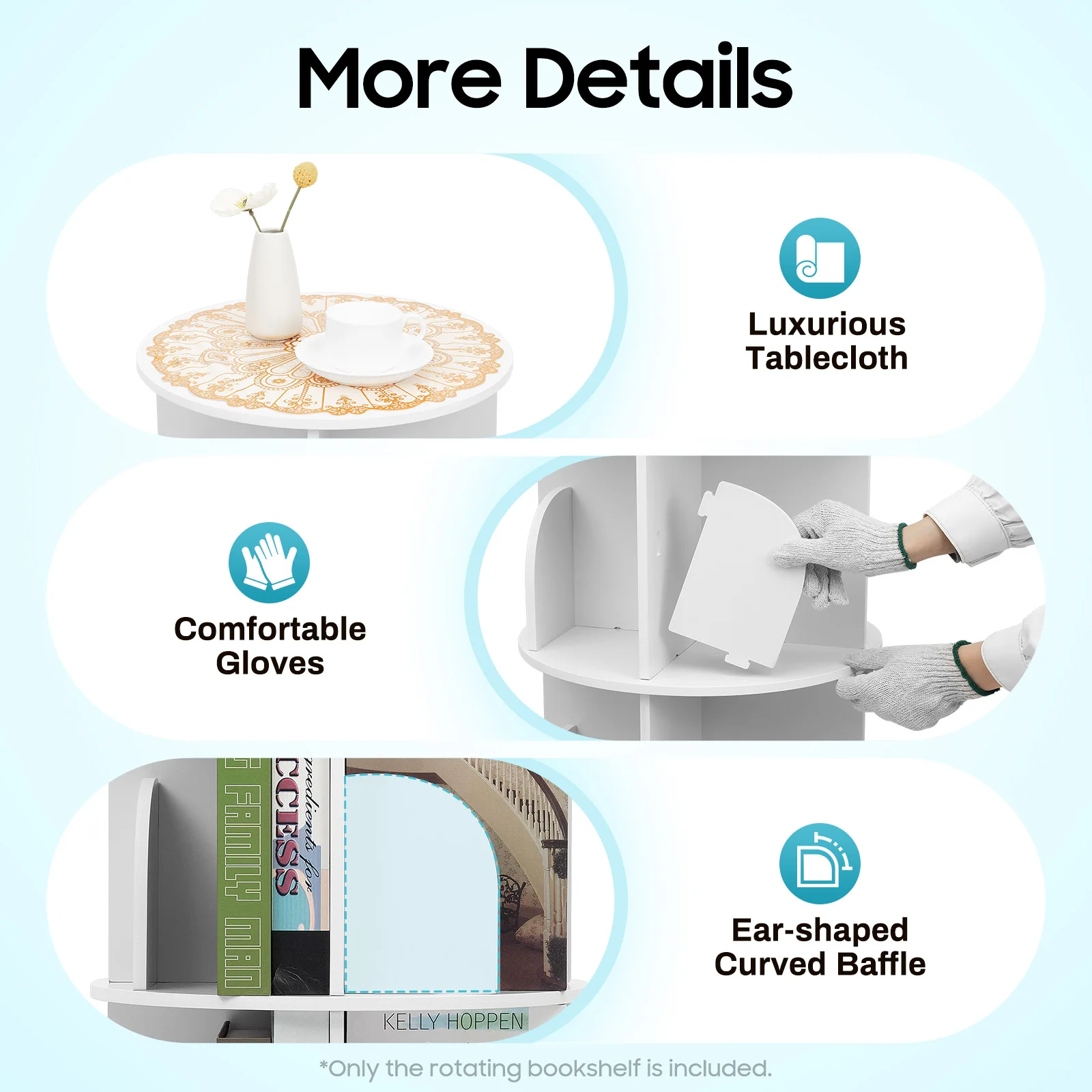 Luxurious Tablecloth: Placing the tablecloth on top of the bookshelf can significantly enhance overall beauty and add a luxurious touch to the home or office environment.