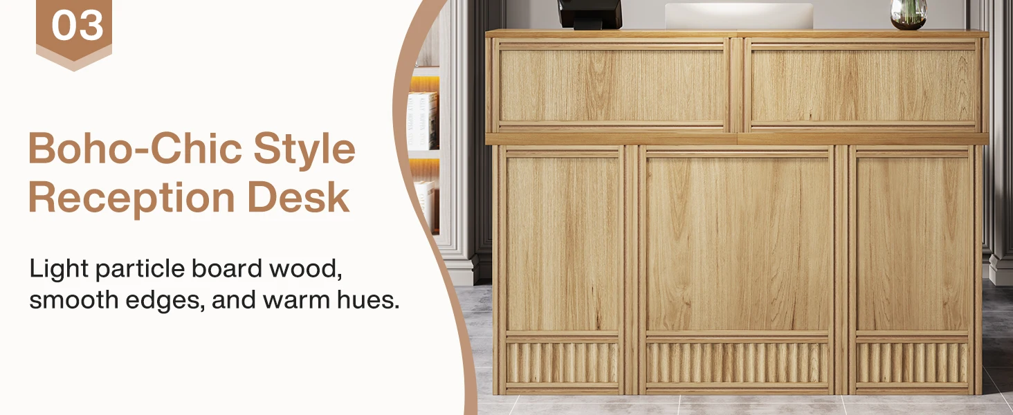Retro Boho Style: This reception desk features a boho chic look that combines style and function. Inspired by rustic country style design, the natural oak finish adds a warm and welcoming touch to a space and helps create a positive first impression.