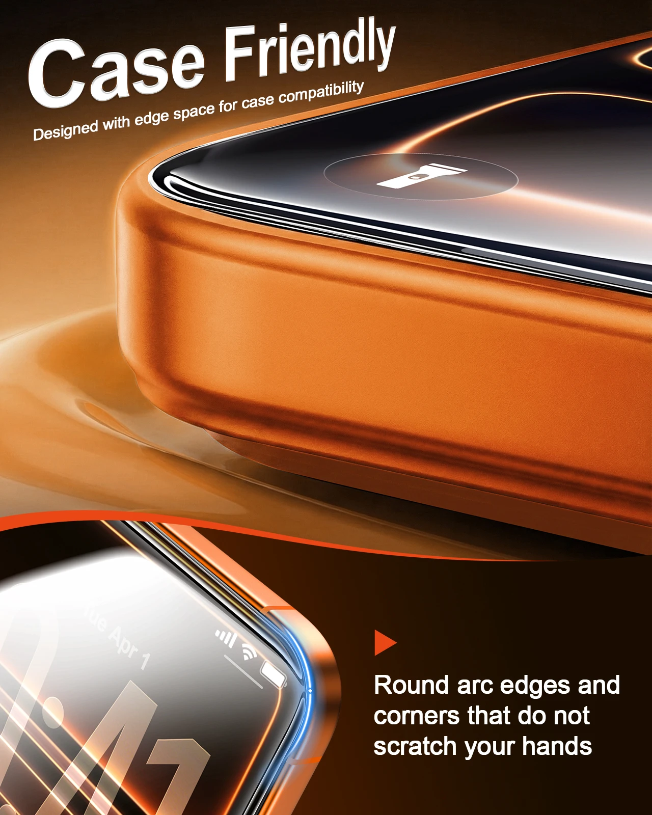 Precise fit with full coverage using a 2.5D edge-to-edge design. Built for strong 360° adhesion, dust protection, and compatibility with most phone cases.