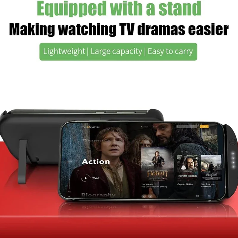 This battery case includes a built-in backup battery that helps extend your phone’s usage time while remaining attached to your device. The LED battery indicator makes it easy to check the remaining power level, and the button control shown in the product images allows you to start charging with a click and stop charging with a double click. A built-in kickstand adds hands-free viewing for videos, streaming, and browsing. The images also show pass-through charging support, which means the phone and case can charge together while plugged in.