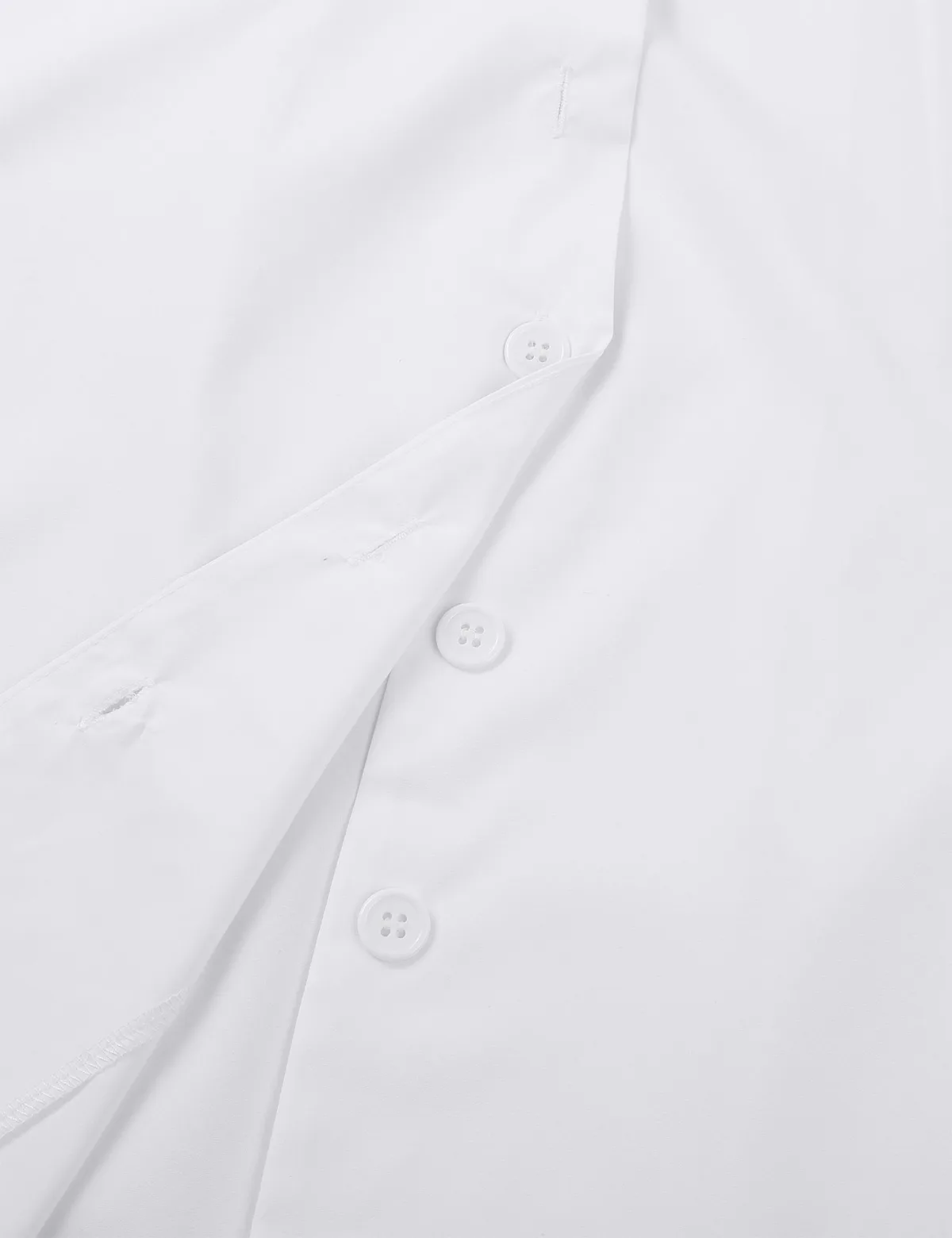 - Features a waist belt that loops through and a front button closure.