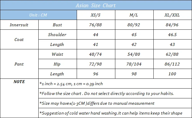 | Components | Top, pants, Jackets |