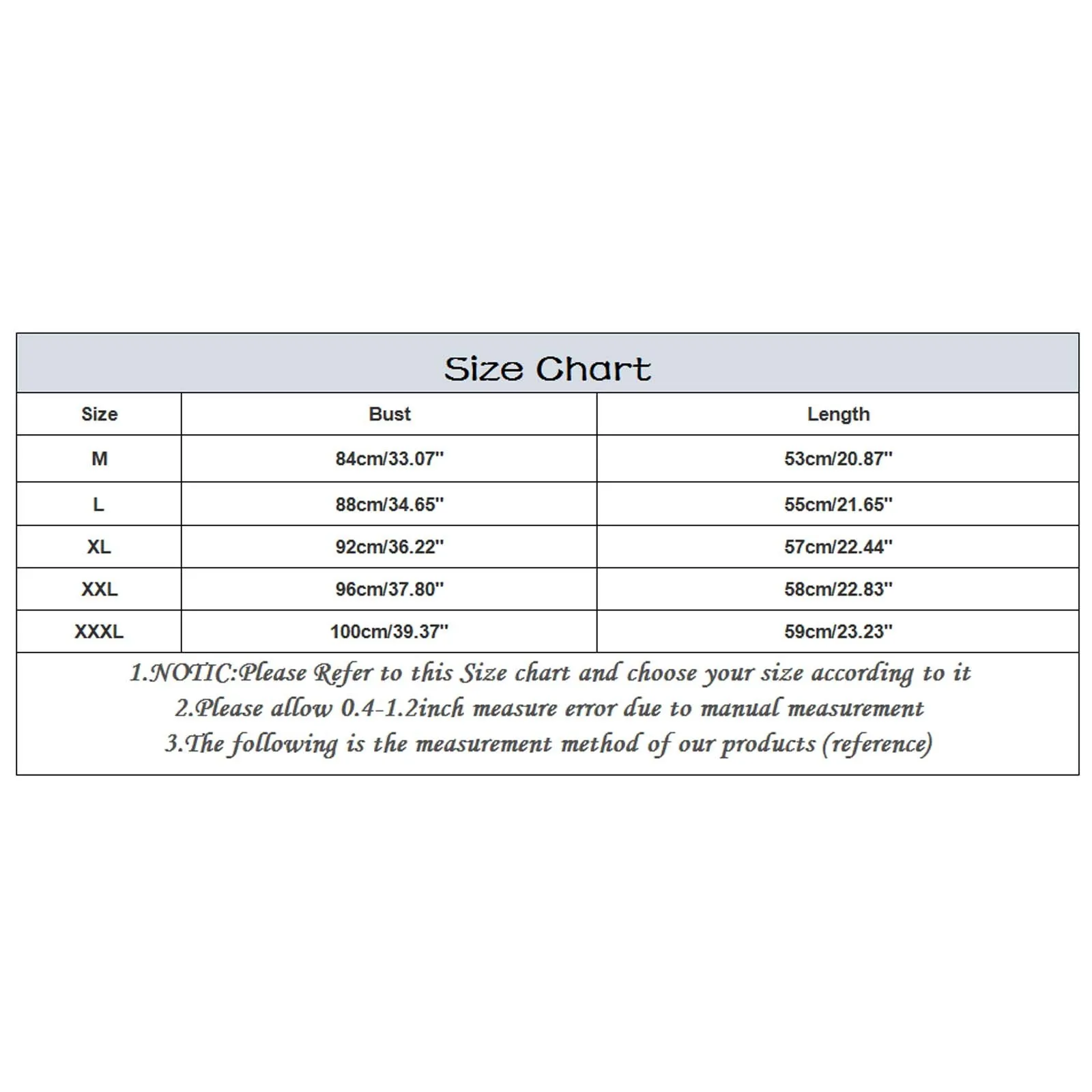 - Triple Extra Large (XXXL): Bust – 100 cm (39.37 inches), Length – 59 cm (23.23 inches)