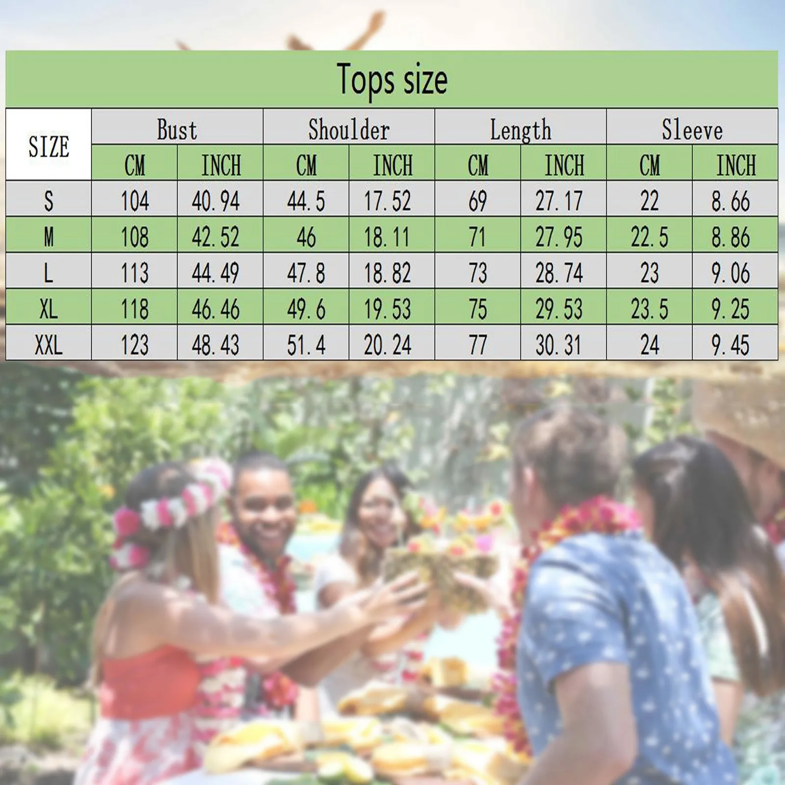 - XXL: US 12, UK 16, EU 42, Bust 123cm/48.43”, Length 77cm/30.31”, Sleeve 24cm/9.45”, Shoulder 51.4cm/20.24”
