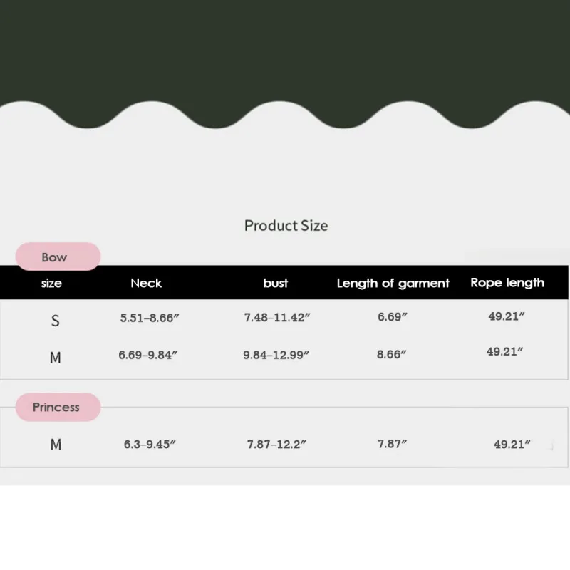Sizes (neck circumference – chest circumference – clothing length – towing rope length): S (5.51-8.66″ – 7.48-11.42″ – 6.69″ – 49.21″), M (6.69-9.84″ – 9.84-12.99″ – 8.66″ – 49.21″)