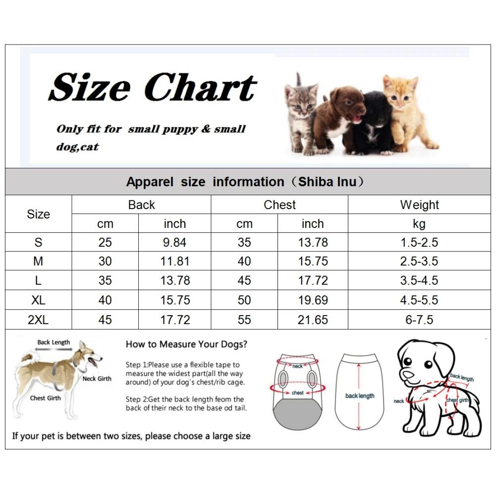 S: Back Length 20cm/7.87″, Chest 32cm/12.60″, Neck 23cm/9.06″